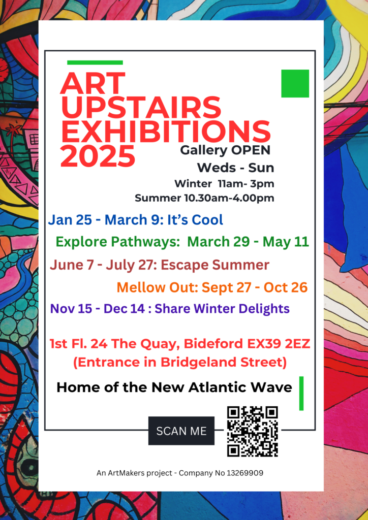 The Art Upstairs gallery opened in July 2023 and is the Bideford home of the New Atlantic Wave group of artists. Find it on the first floor at 24 The Quay, Bideford, EX39 2EZ. Art Upstairs is an ArtMakers project run and managed by local artists on a voluntary basis. To support our work please donate HERE
