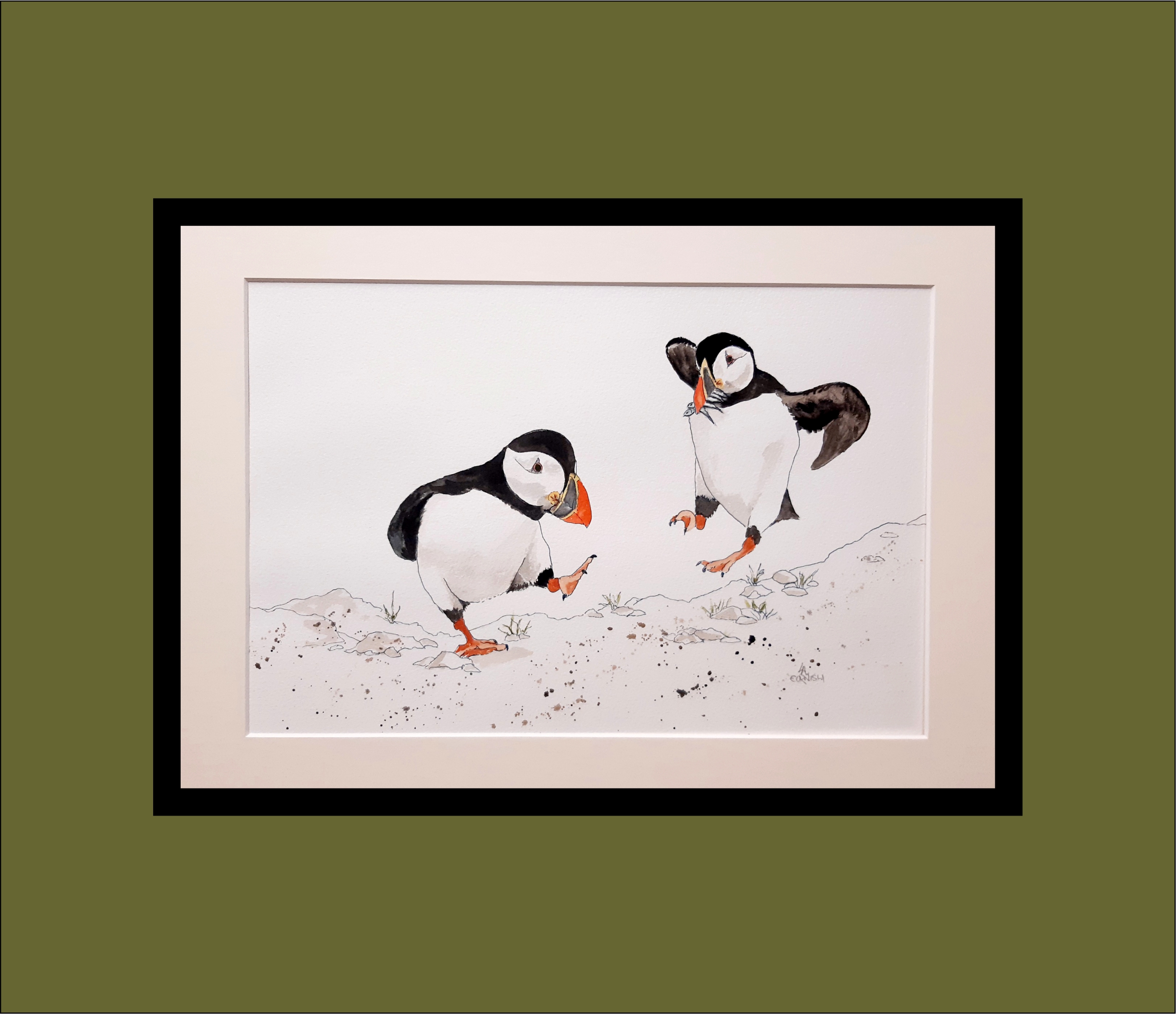 Here is a simple drawing, in inks, of a couple of puffins. One just back from a fishing trip, the other eager for lunch. Presented in a 16" x 12" mount (outside dimensions), for sale unframed with certification.