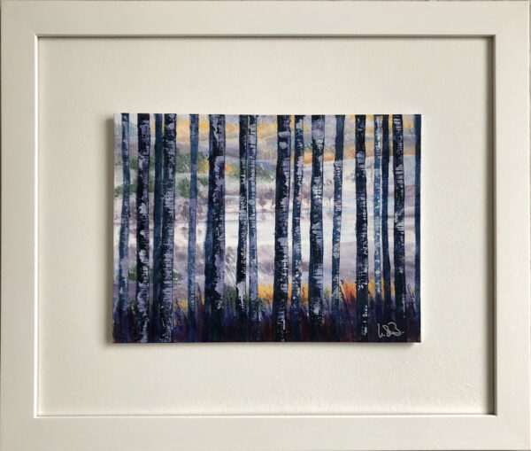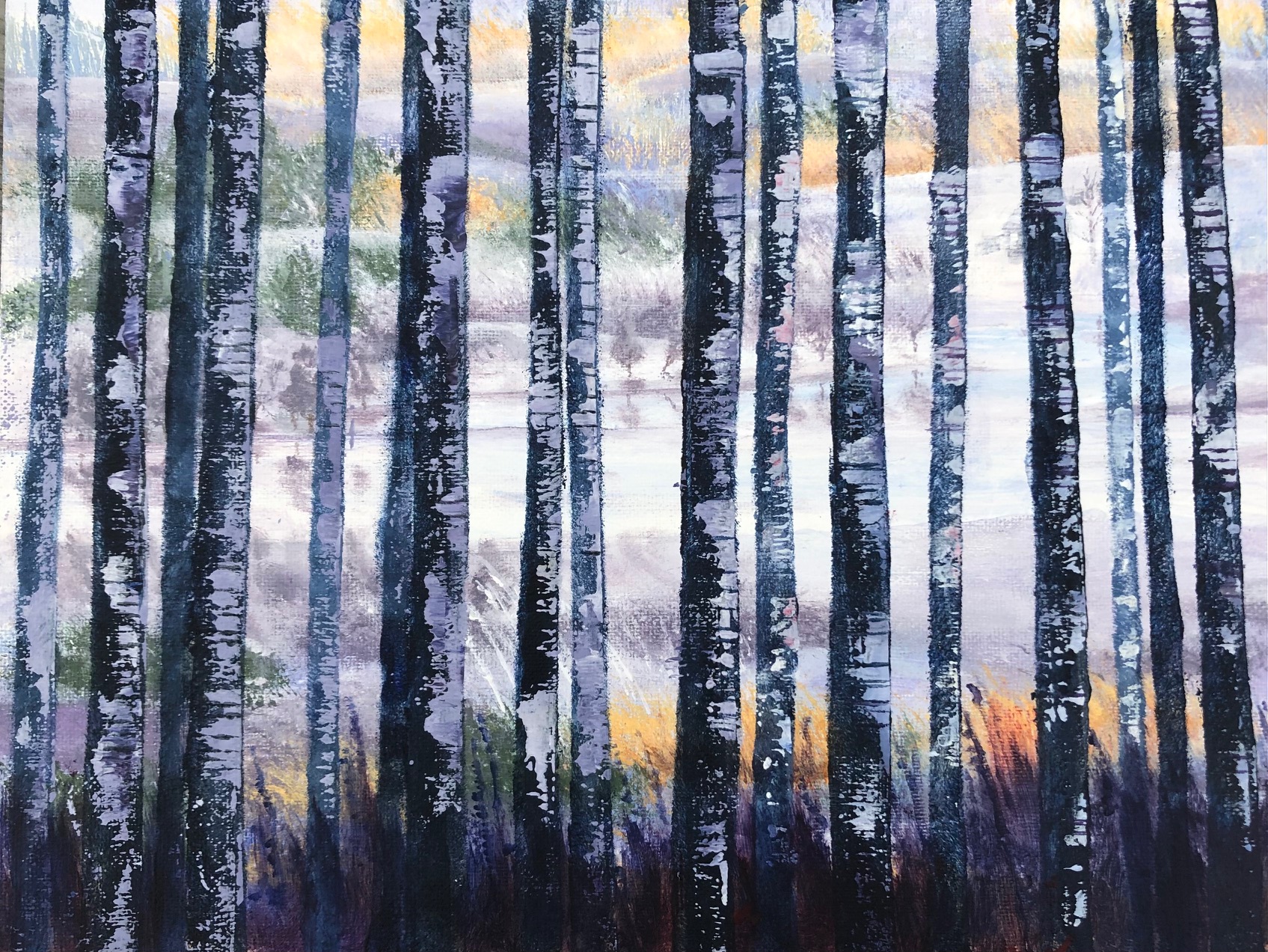 Totally imagined view through a birch woodland to a bleak wintry landscape beyond.