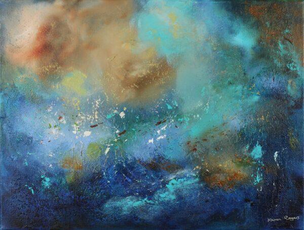 This beautiful abstract painting is acrylic on canvas measuring 39cm x 30cm (12in x 15.5in). Drift away as the seas calm and the skies brighten in this vibrant and atmospheric painting, full of texture and movement. It will lighten your mood and revitalise your spirits each time you explore all the painting has to offer. This painting is available either unframed or in a floating frame in black or white.