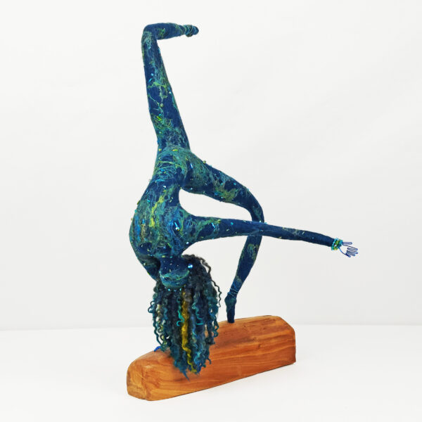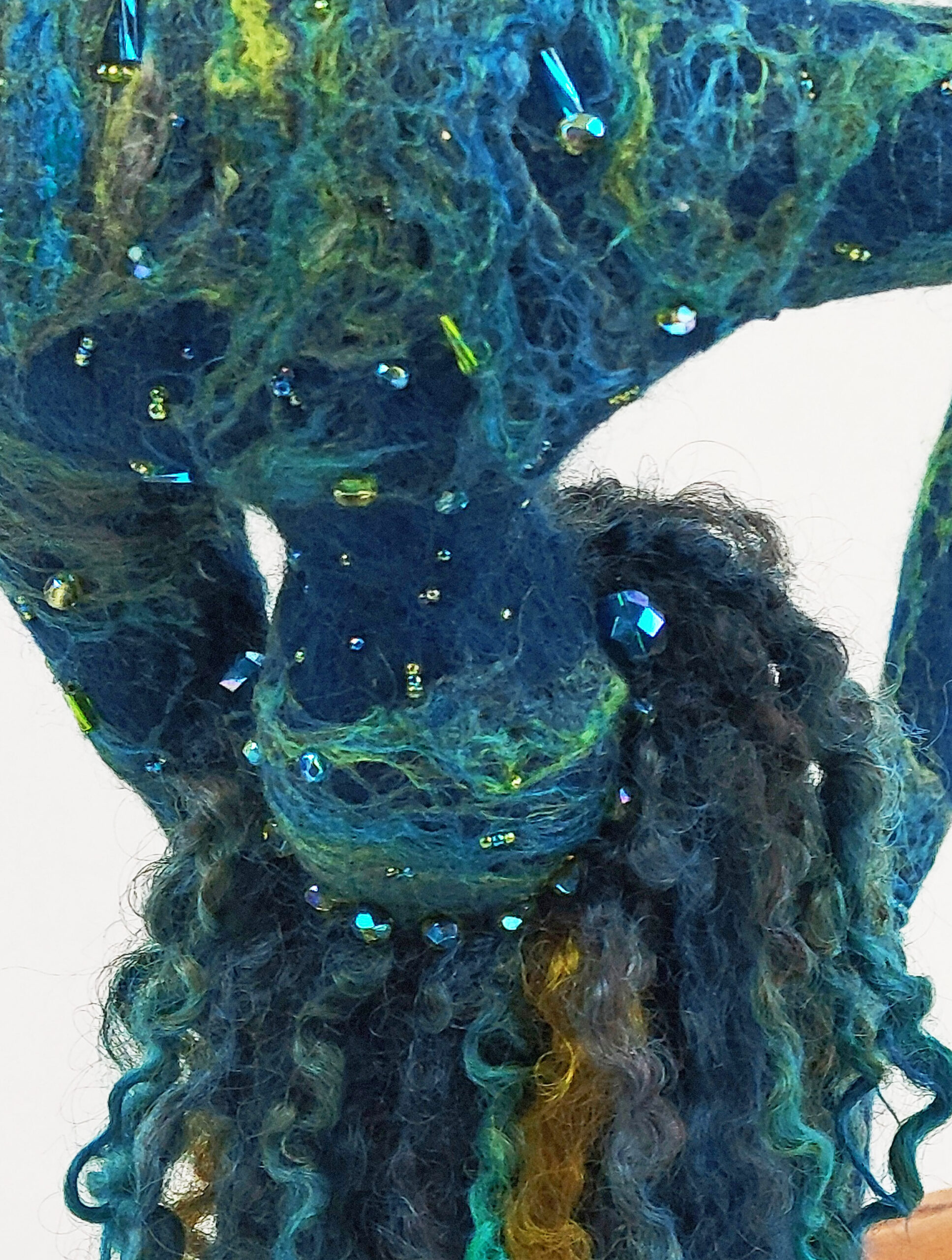 Energetic felt sculpture created with wet felting techniques and embellished with silk, hand dyed locks and beads.