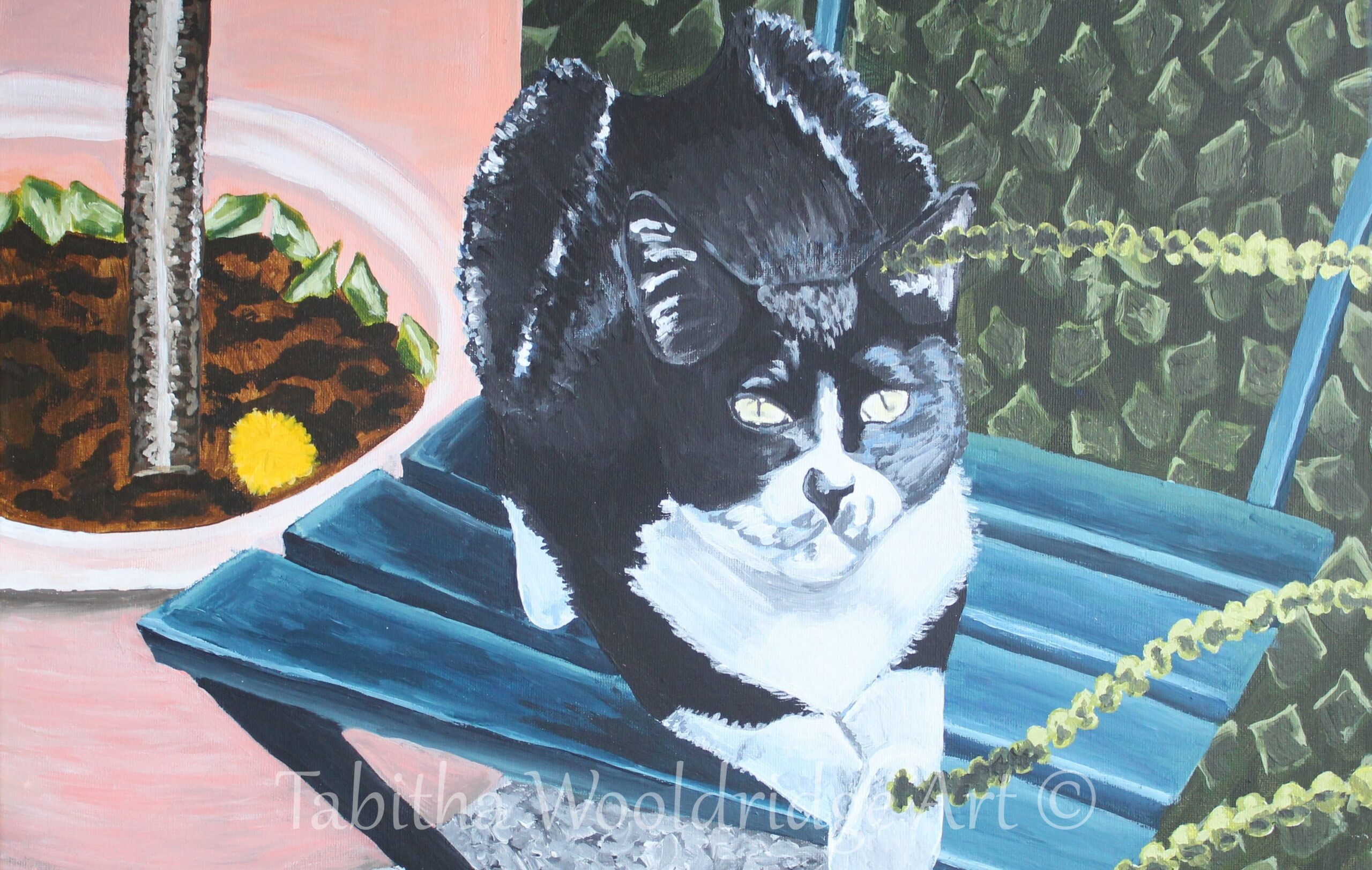 The painting shows the cat at his happiest, outdoors in its natural environment. This painting is done in acrylic on canvas.