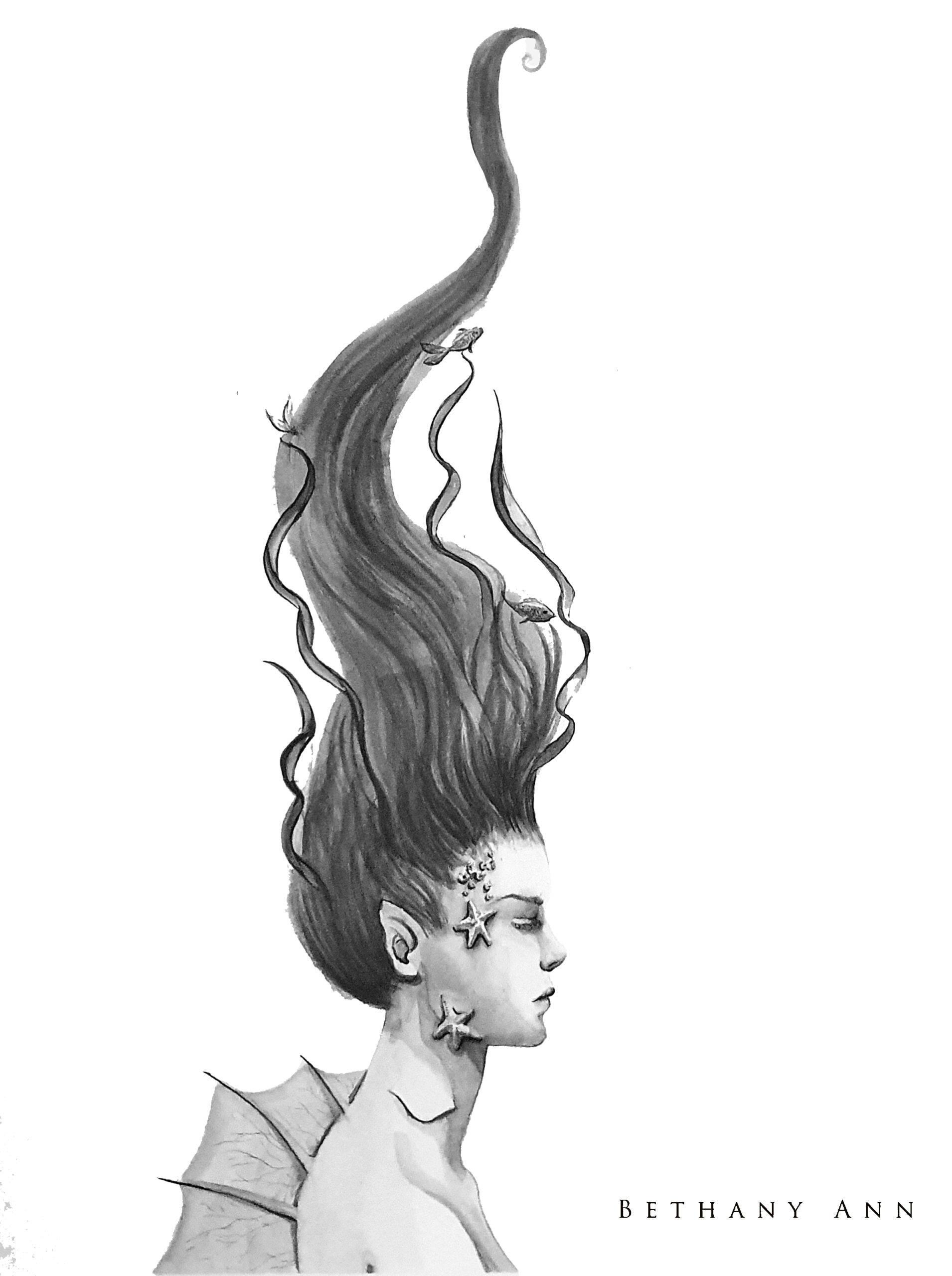 Painted in watercolours for the daily mermaid challenge - Mermay 2023, I fell in love with the idea of a mermaid covered in starfish, barnacles and limpets, as if she'd become one with the sea.