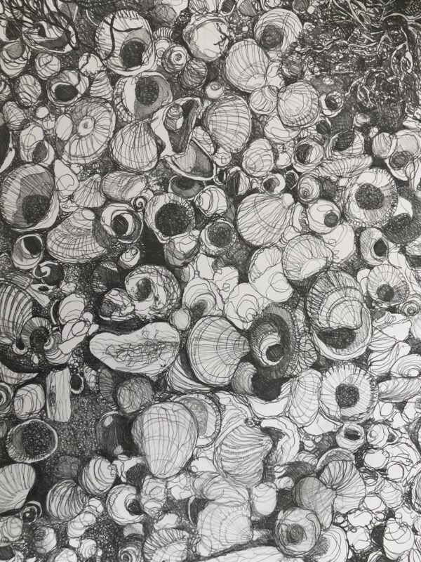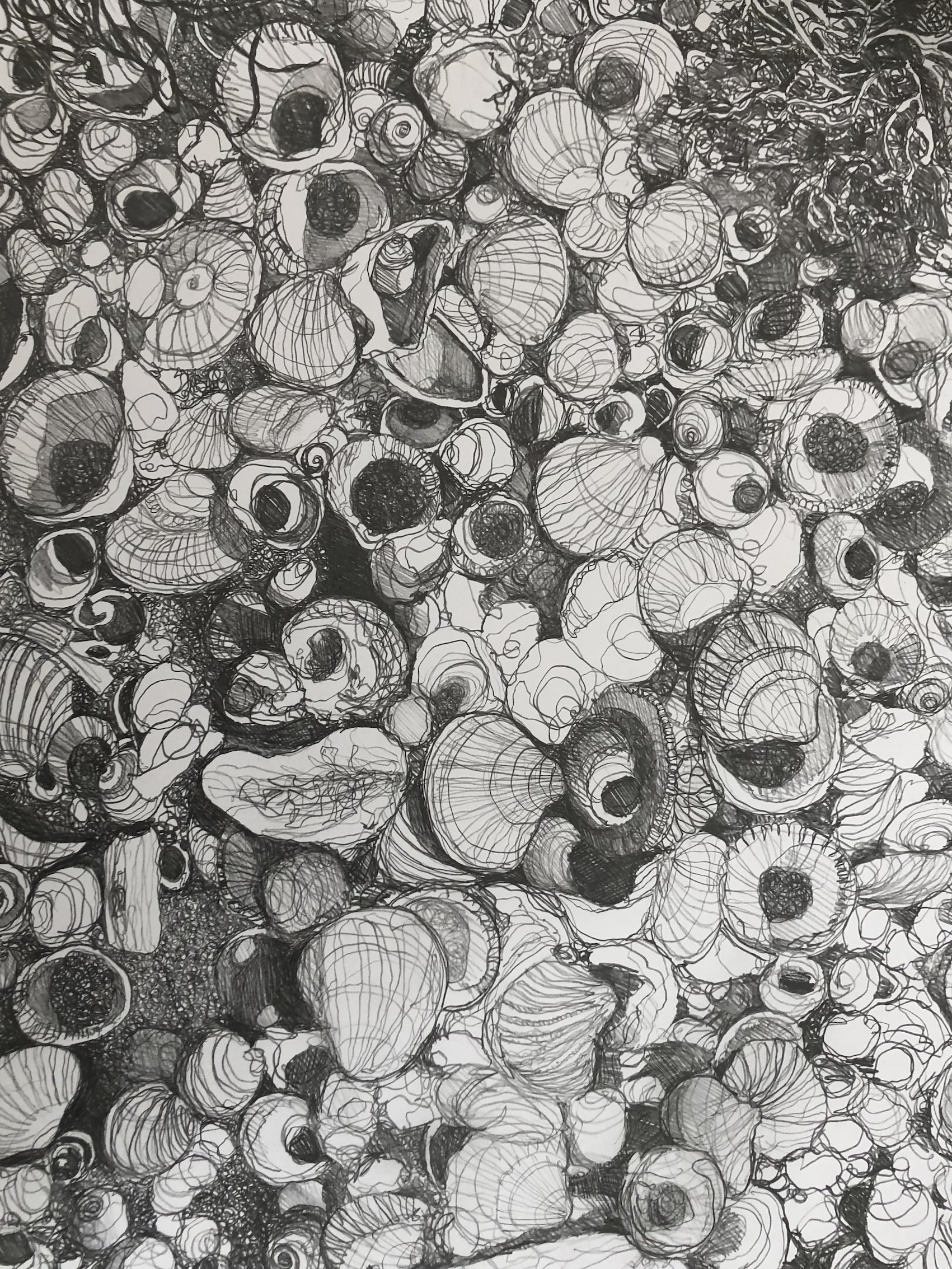 Pencil detailed illustration of shells based on a photo taken on back beach in Instow whilst walking the North Devon coast path .