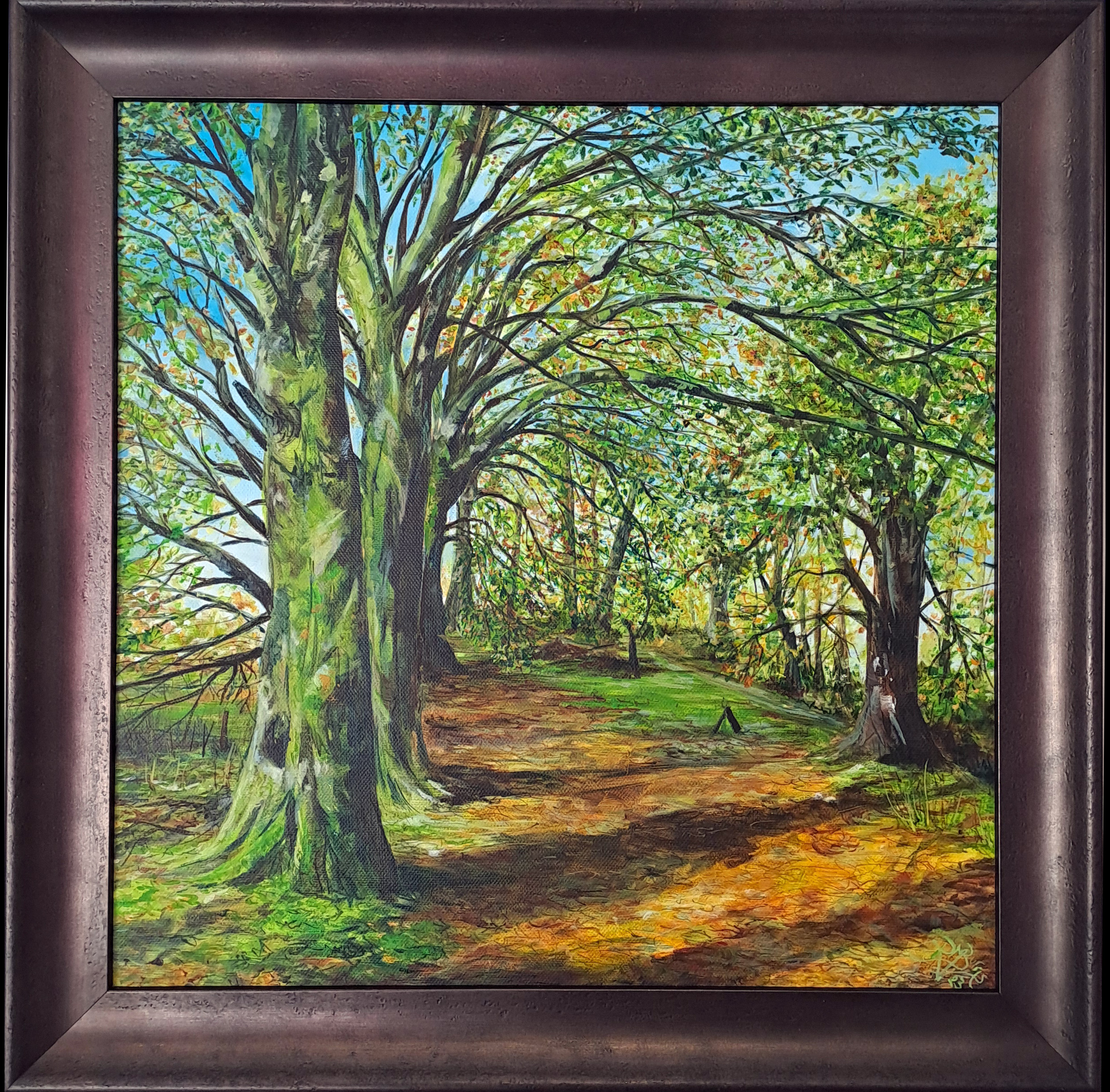 The cool blue October skies, mossy green beech trees and blanket of fallen leaves are a mellow meander towards winter, the amber glow and long shadows alluring. Oil on canvas, part of a year at Arlington Court series,