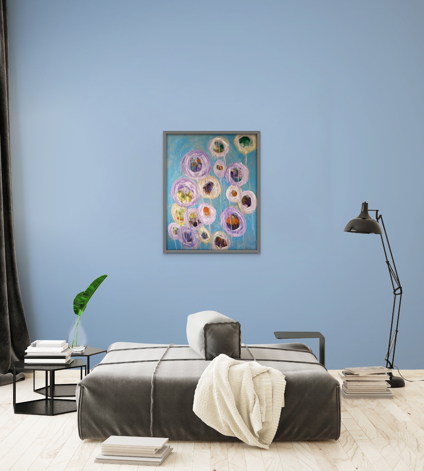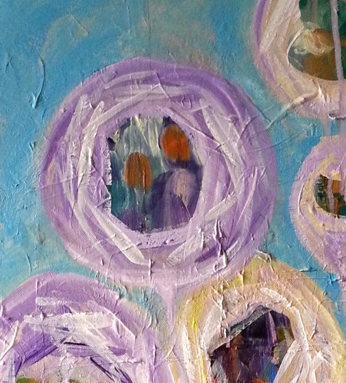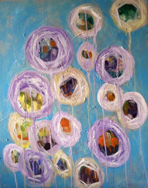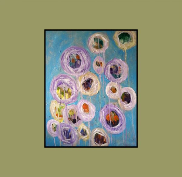 This is a fun abstract work, acrylics on canvas. Are they balloons or flowers? Multicoloured details encircled by lilac and cream surrounds, painted on a blue ground. For sale unframed with certification.