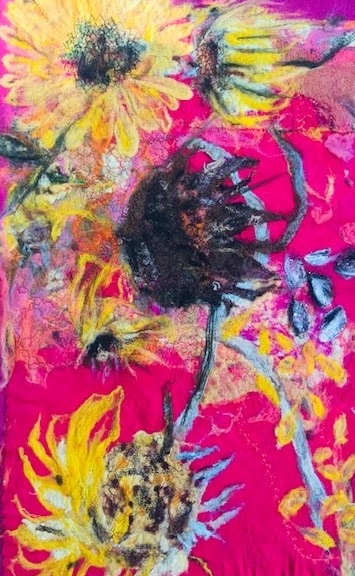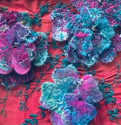 Spring Blooms in blue and pink - felted and stitched on a stitched silk background and embellished with beads