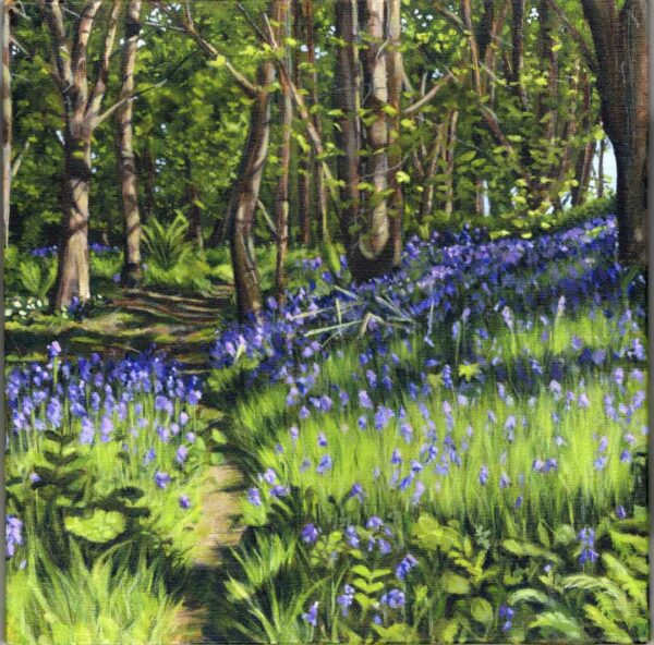 Bluebell woods on a sunny afternoon in late April at Docton Mill Gardens - acrylic on canvas. Original photo taken at Docton Mill.