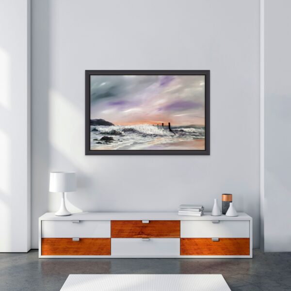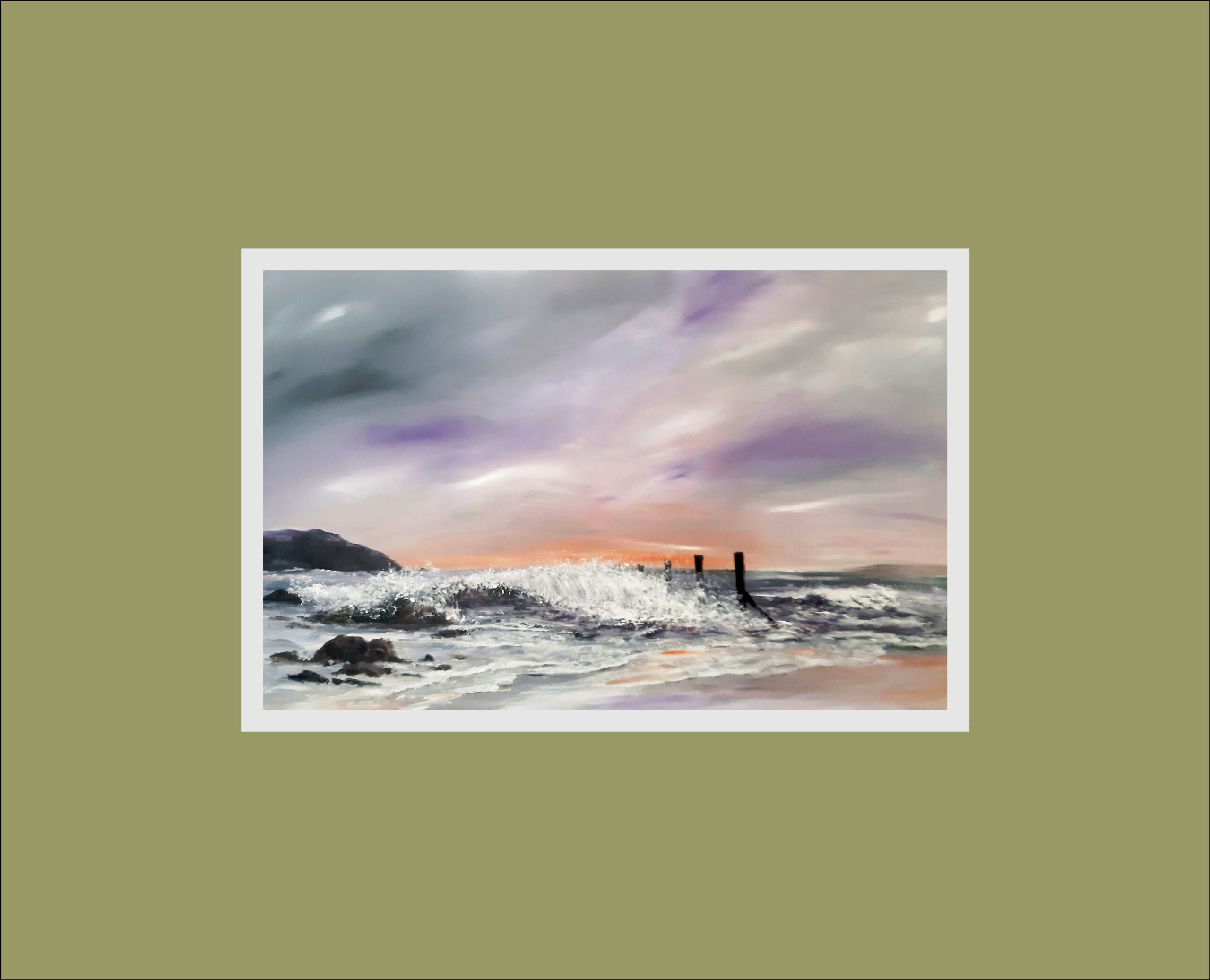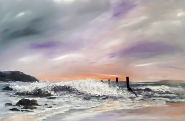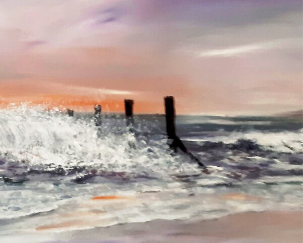 This work is a large feature seascape in acrylics. It features waves breaking over the shore and against the old wooden groynes, with hint of a sunset in the orange and purple sky. For sale unframed with certification.