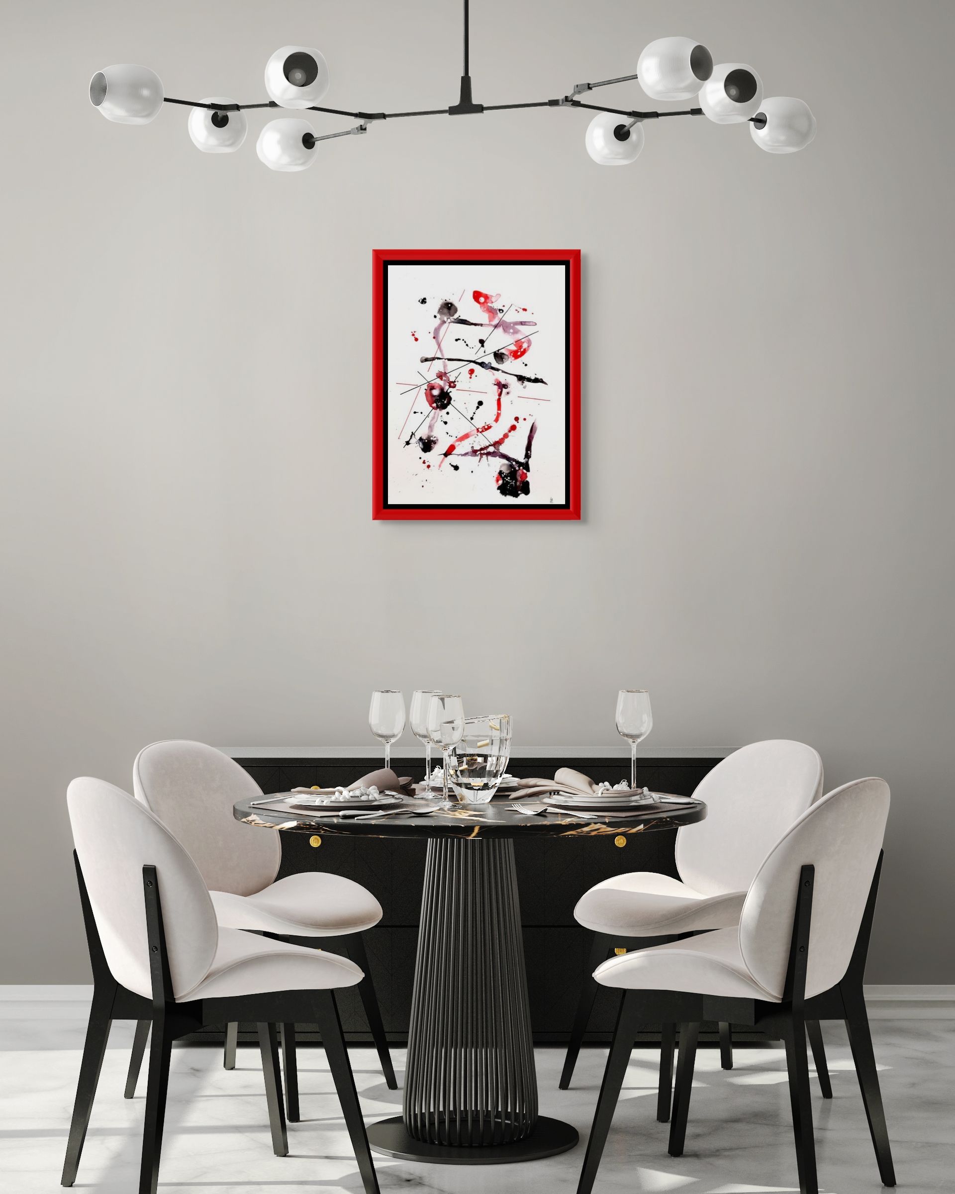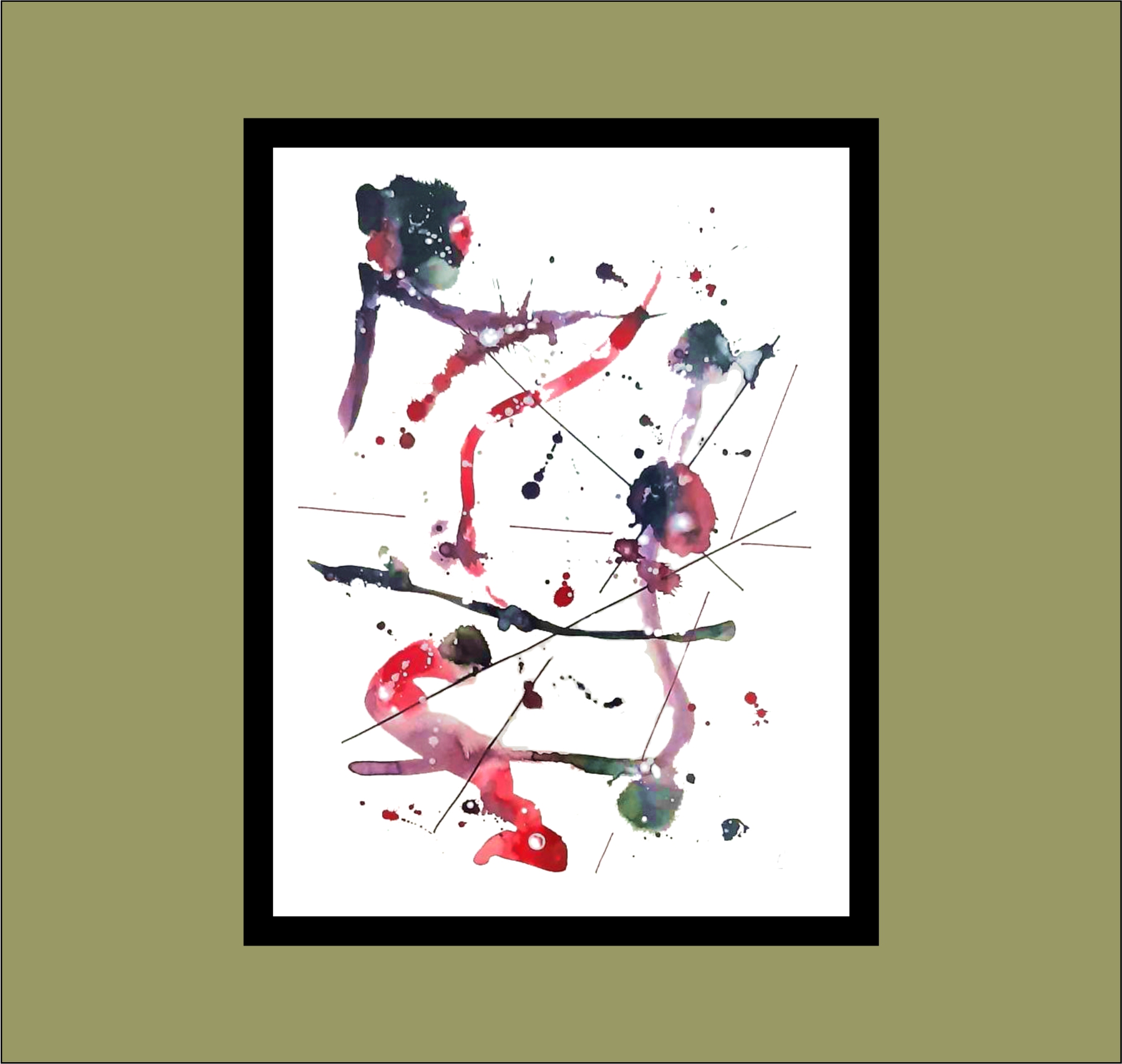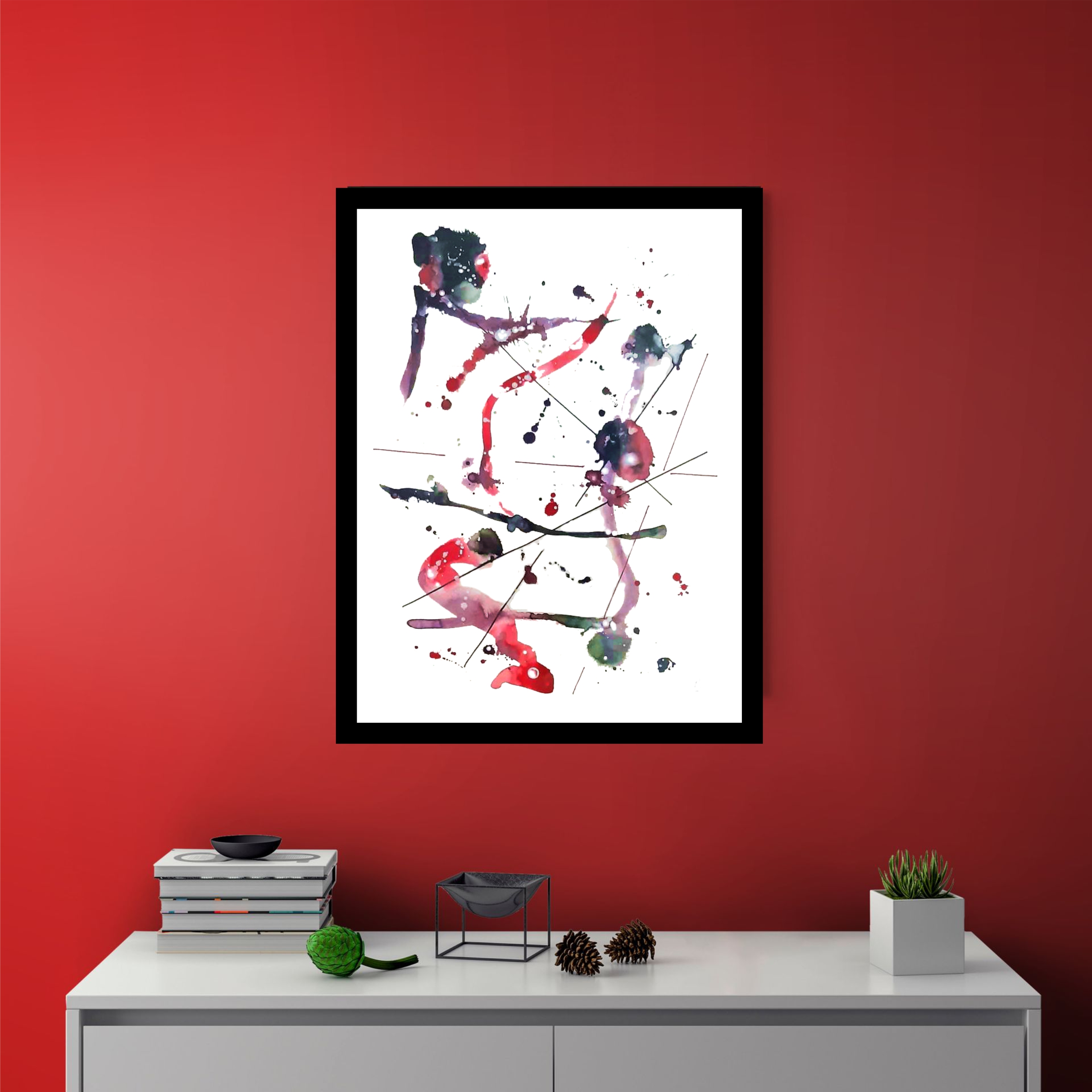 A minimalist abstract in black and red inks on 300lb paper. Inspired by cracked glass, this piece will form an interesting feature on any wall. For sale framed, with certification.