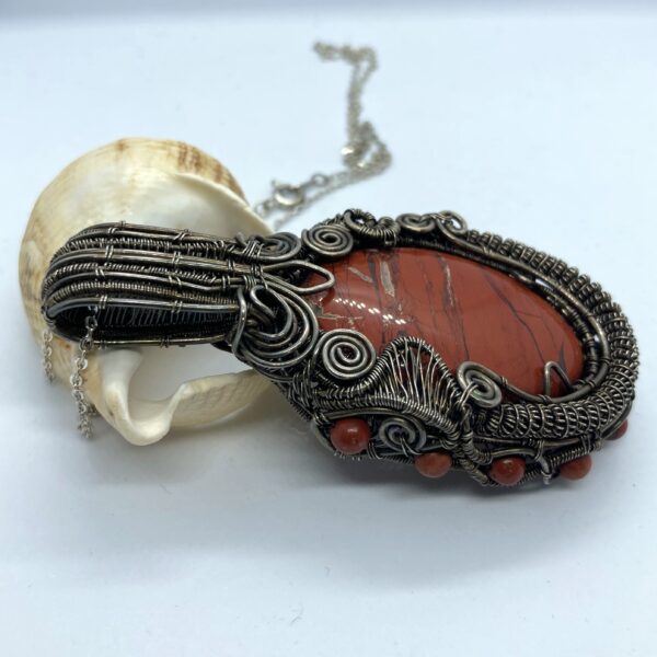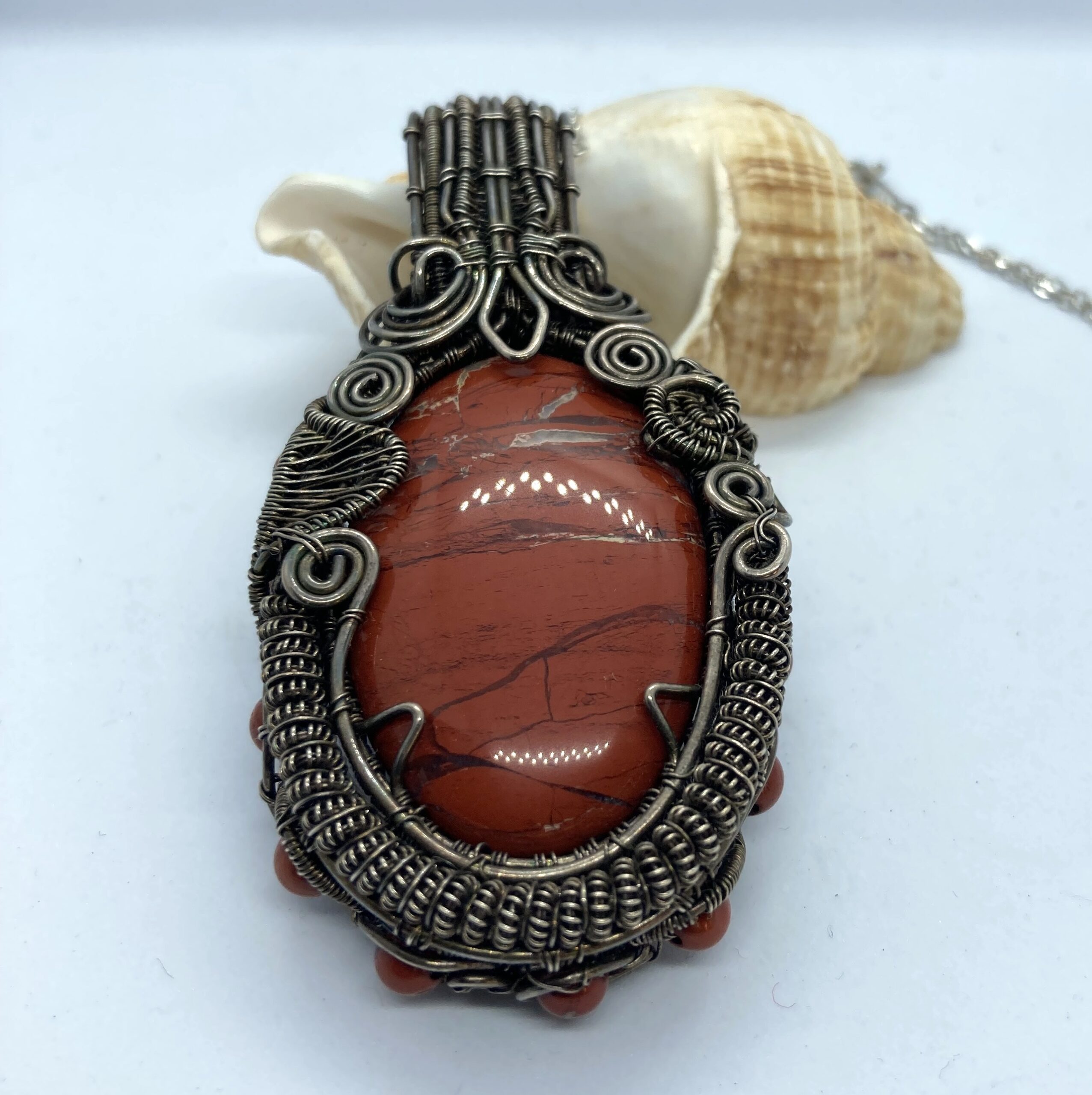 Large Statement Pendant. Red Jasper wrapped in silver filled wire with jasper accents. Antiqued and polished. Handmade and designed by me.