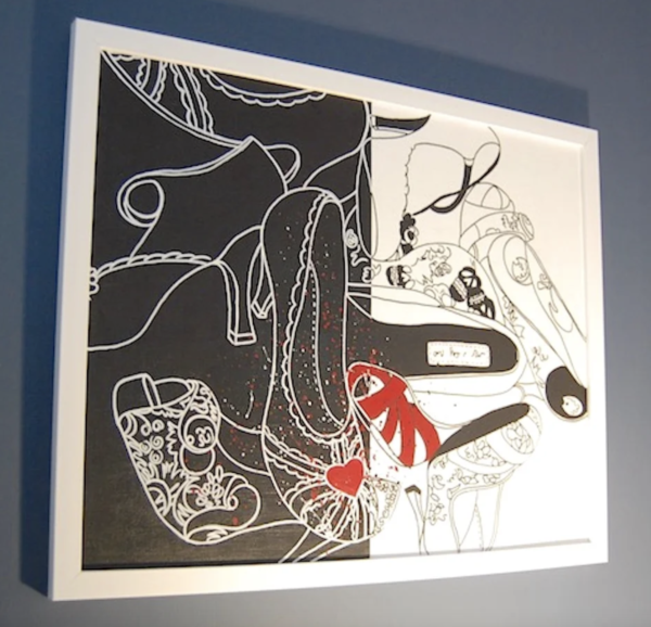 Image 1 of Original Acrylic Painting. 'Buying Shoes isn't black or white' Image 2 of Original Acrylic Painting. 'Buying Shoes isn't black or white' Image 3 of Original Acrylic Painting. 'Buying Shoes isn't black or white' Image 4 of Original Acrylic Painting. 'Buying Shoes isn't black or white' ORIGINAL ACRYLIC PAINTING. 'BUYING SHOES ISN'T BLACK OR WHITE' £45.00 ‘Buying shoes isn’t black or white’ An original acrylic painting of a pile of shoes, in black and white with a splash of red. Signed by me on the label of one shoe. On canvas board and measuring 20″ x 16″ UNFRAMED. This original would look equally good framed and hung on a wall or propped up on a shelf as it is . Great for any shoe addict, like me!