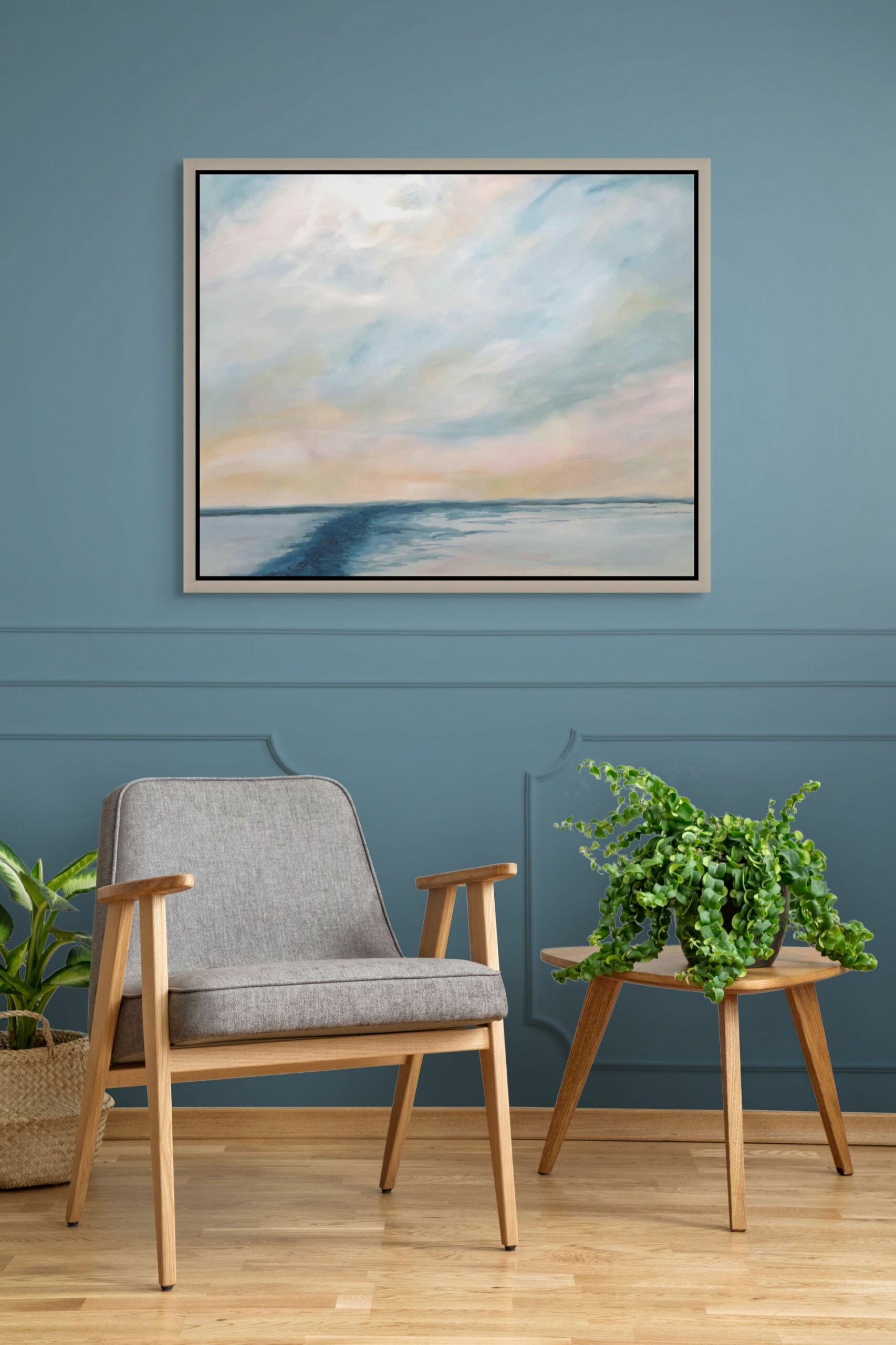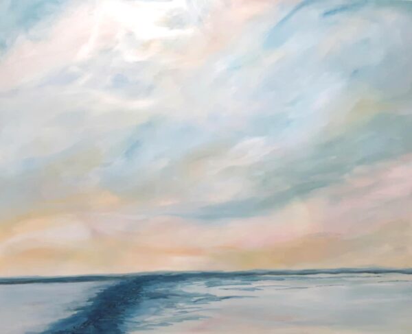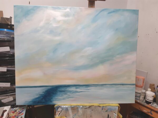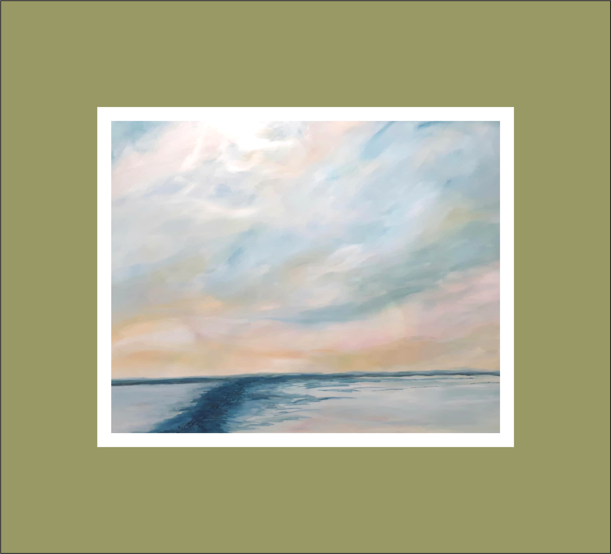 This simple but effective impressionist piece is painted in acrylics. A tidal causeway leads to the low island across the bay, under a changeable sky. Available unframed, with full certification.