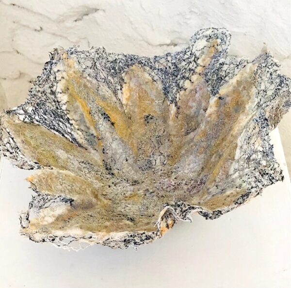Stitched fabric and water soluble fabric, moulded into a bowl shape, hardened with fabric hardener and mounted on a wooden base