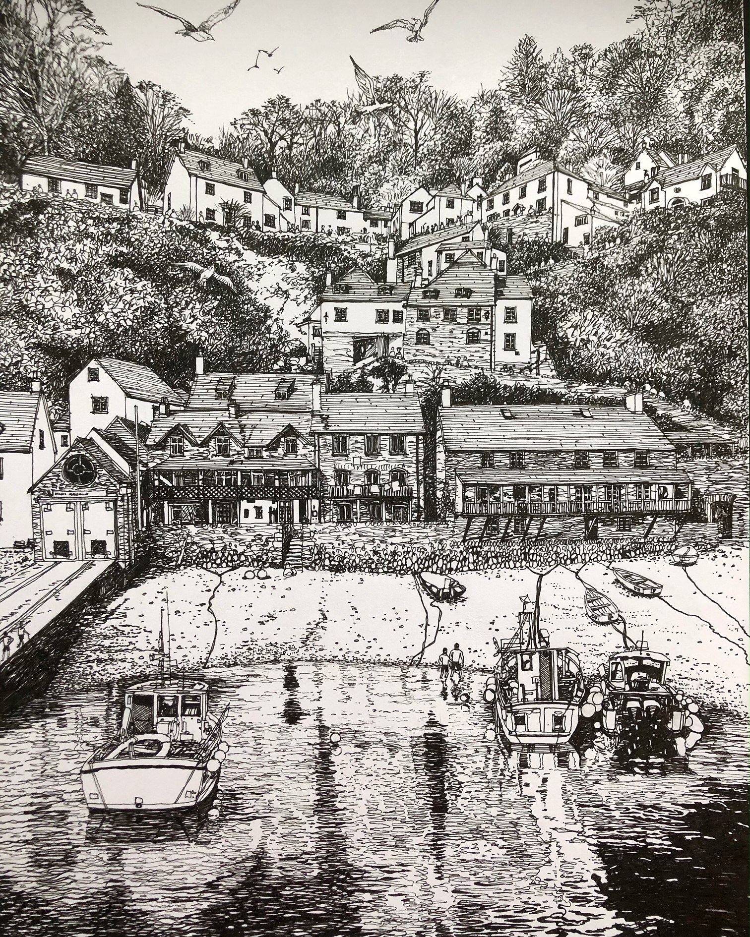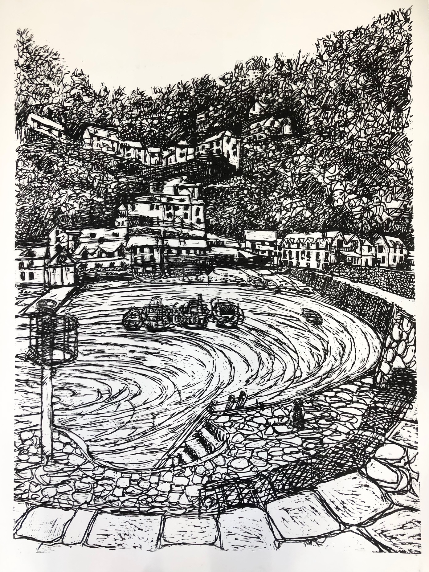 A Woodcut collaboration between Merlyn Chesterman and myself of Clovelly Harbour .