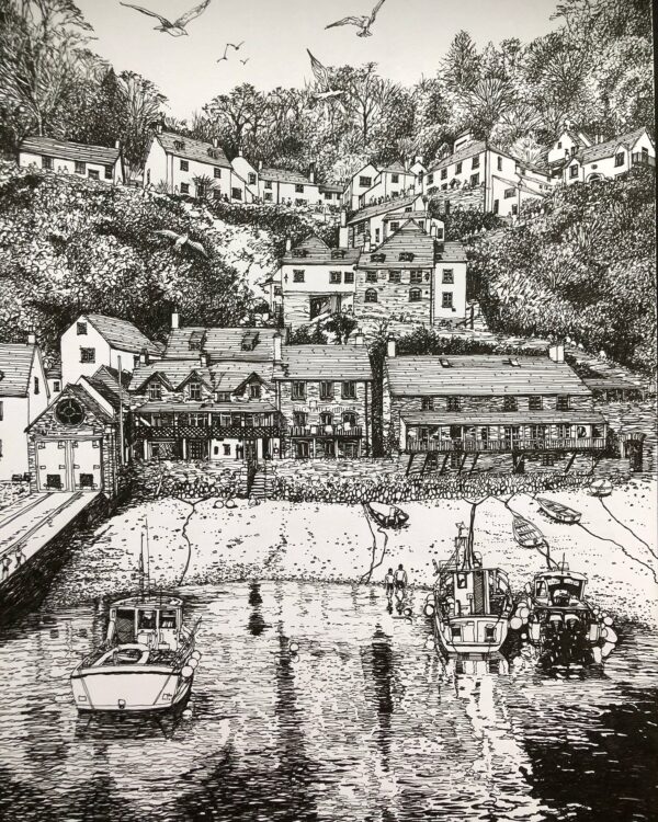 Limited edition signed framed print of Clovelly Harbour one of the most instagrammable Villages in the UK. 0.1 Fine liner illustration capturing the dramatic scale and uninterrupted view of this amazing North Devon coastal location.
