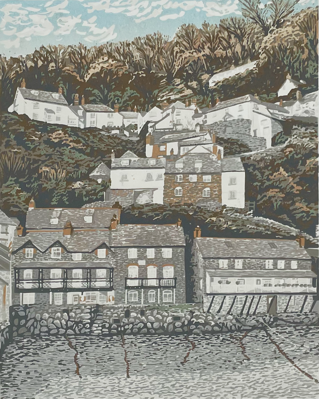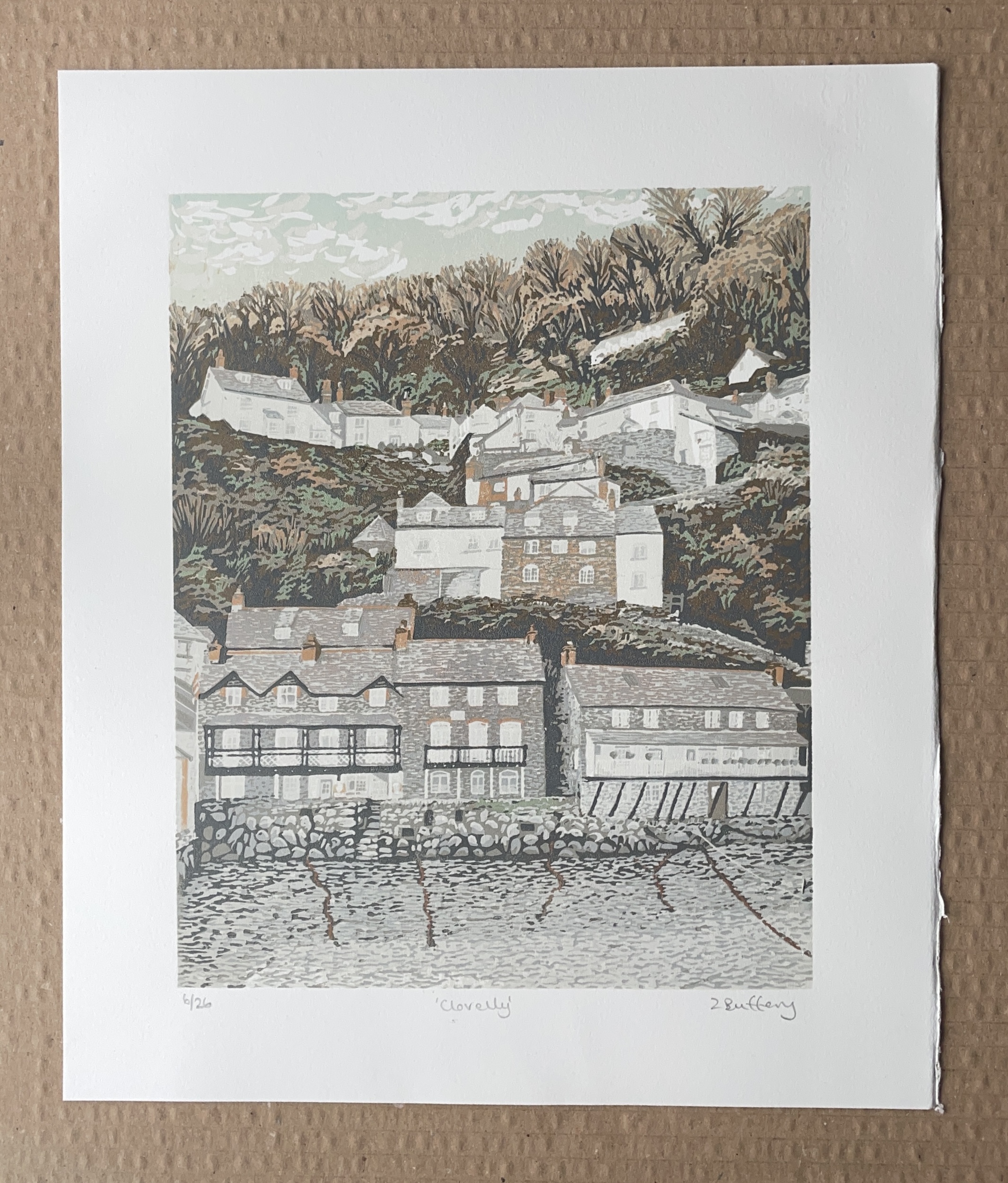 Handprinted, limited edition linocut of the picturesque fishing village of Clovelly on the North Devon coast. Image size is approx 20.5 x 25.5cm, plus generous border to allow for framing. - Limited edition of 26 - Each print is numbered and signed by myself on the front of the artwork. - Oil based printmakers ink, on 250gsm acid-free printmakers paper. - Reduction printing technique. - Sold unframed and unmounted. Packaged with acid free mount-board backing.