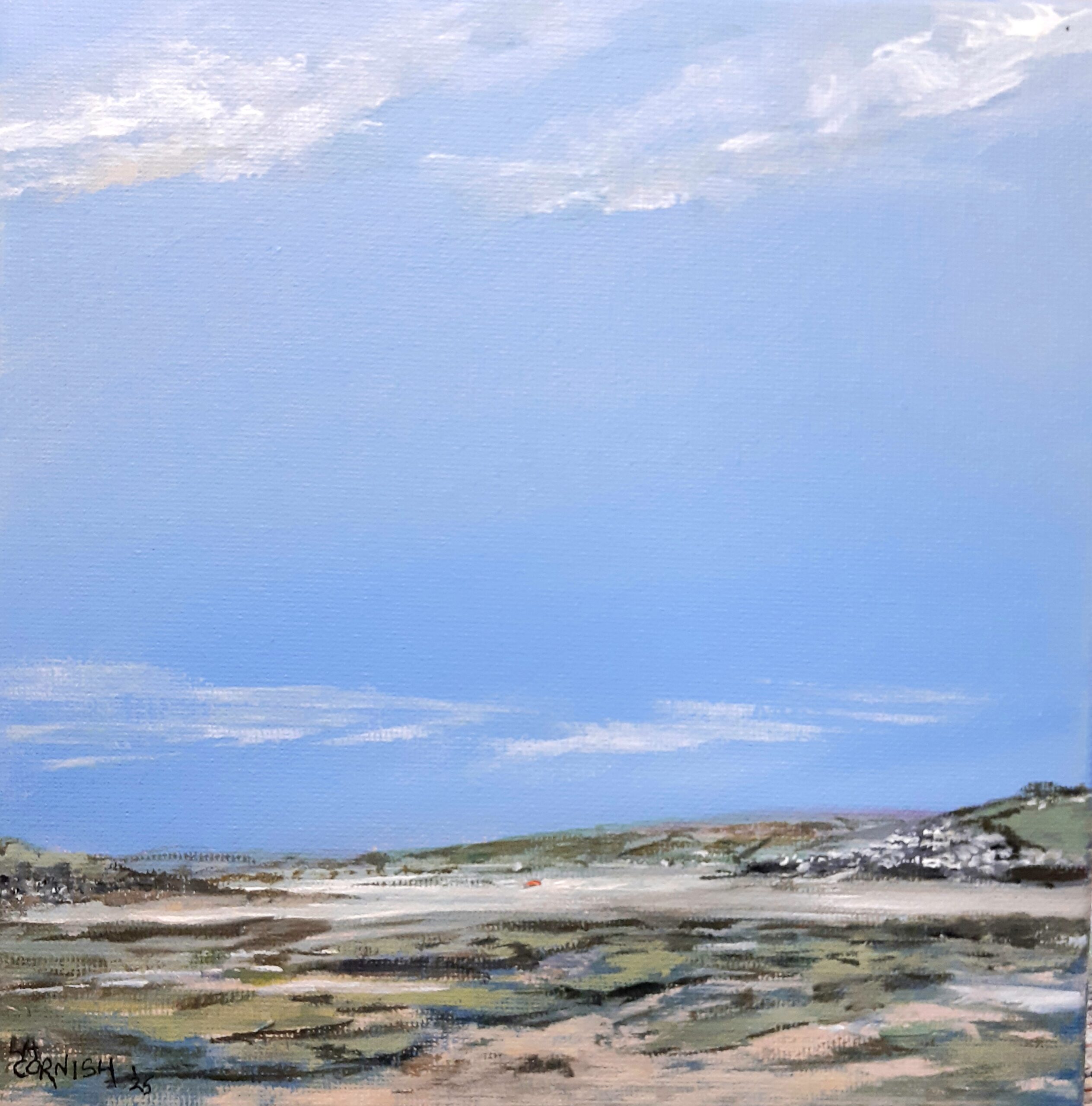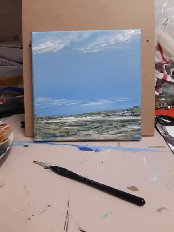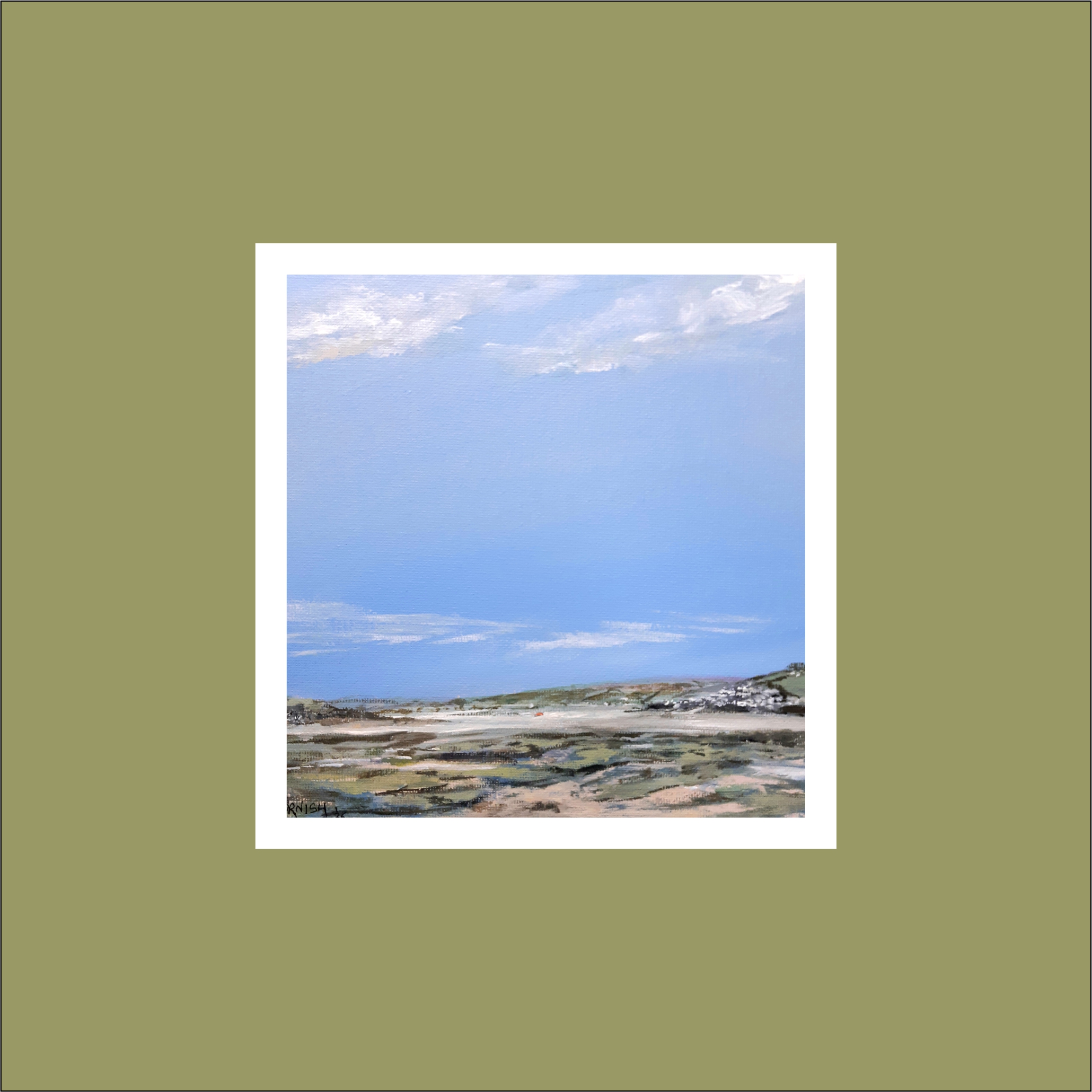 This little 8" x 8" acrylic painting is a view across to Instow from Northam Burrows, with the RNLI lifeboat stationed at Appledore moored safely in the Torridge estuary. For sale framed with certification.