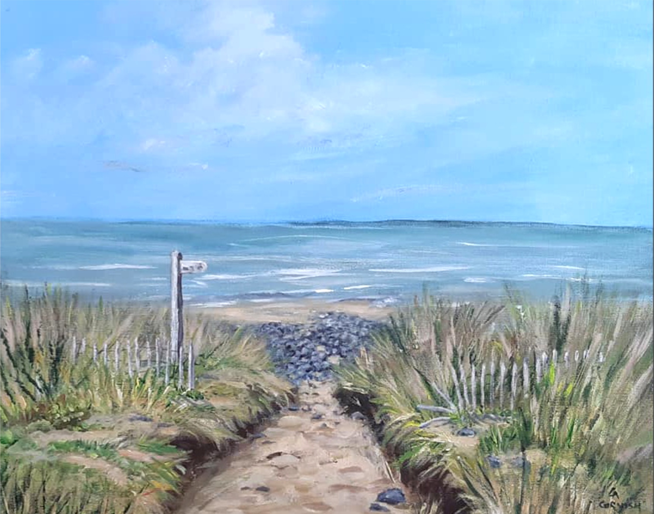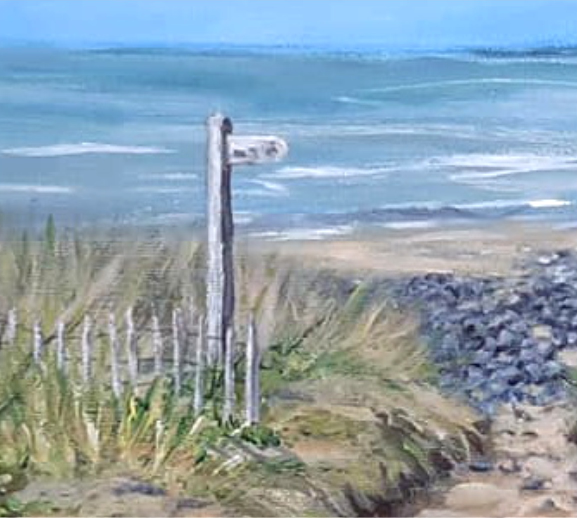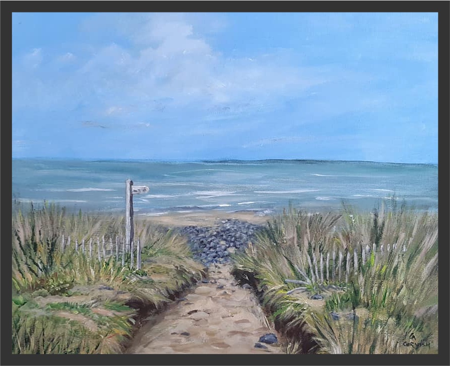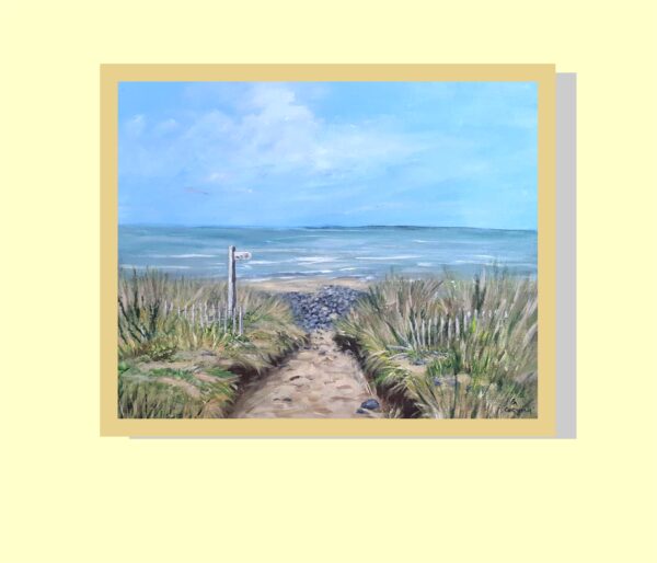 Locals and visitors to North Devon will be familiar with our coastal path, through the dunes and along the pebble ridge. This imaginary seascape bring those elements together with a signpost to show the way. Painted in acrylics on 16" x 12" deep edge canvas, shown with a plain wood float frame mock up. Original work for sale unframed, Certificate of Authenticity provided