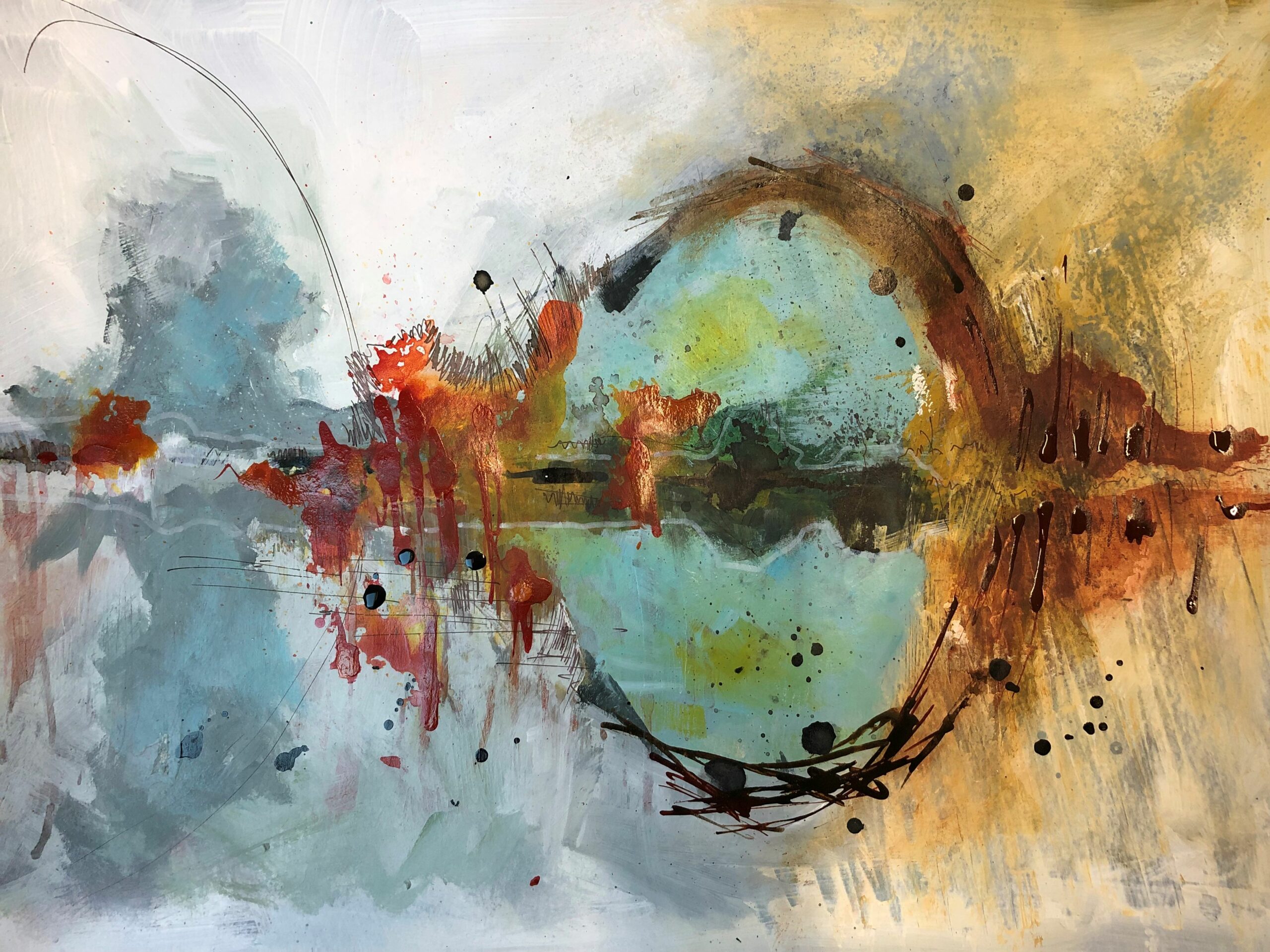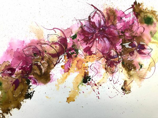 Acrylic paints and inks on paper, framed behind glass. The image depicts the joyousness of the magnolias opening to their full glory.