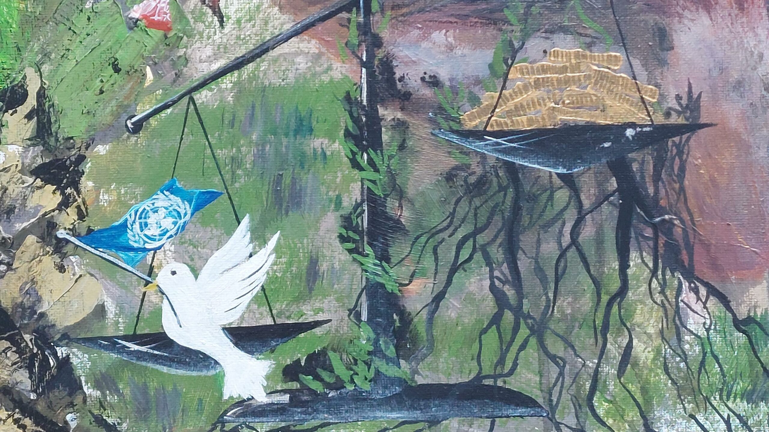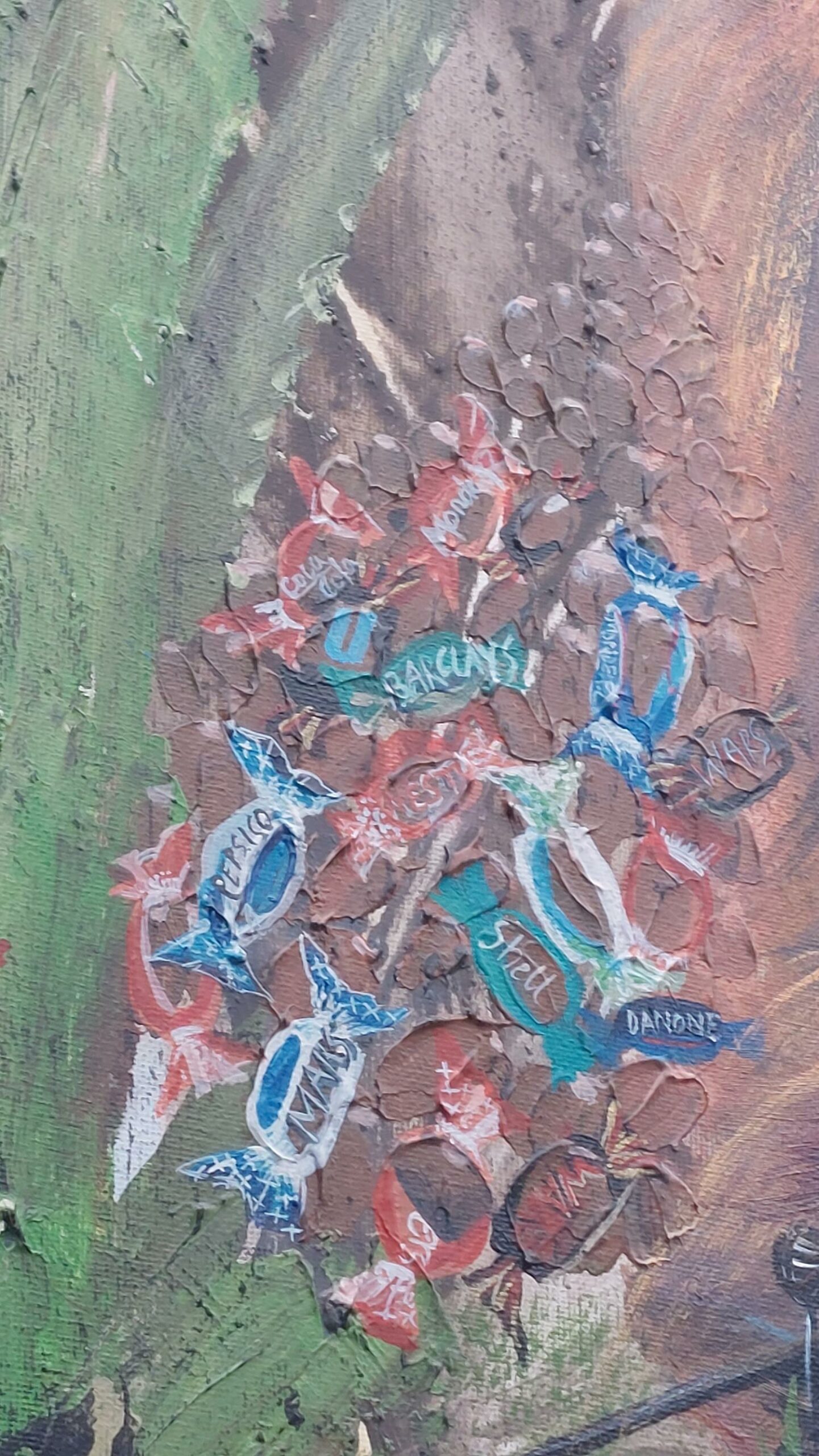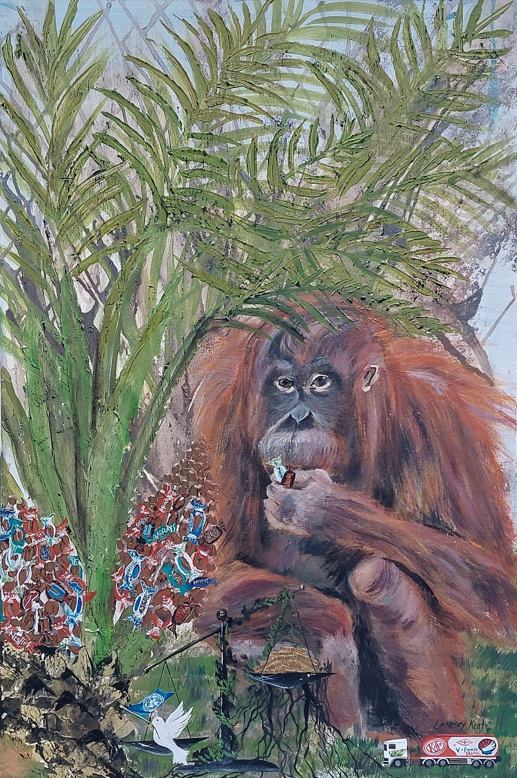 Palm oil for fuel and food plus trade wars is devastating the rainforest and natural habitat of Orangutans. The sweet wrapper-clad palm nut kernels depicted represent the companies destroying the rainforest and food we are all-consuming in ignorance, despite the consumer power we hold in the west. This is represented by the scales of justice being wrapped by the root of all evil, also the gold weighs heavier than the dove of peace. The Helang palm oil fuel truck displays the word 'Killer', stylised in the Kit Kat Font, which is inspired and taken from the Green peace campaign. Finally the font on the sweets in the Orangutans hand depict Wars, instead of Mars. This is a reflection of the shorter palm tree that the orangutang sits under, a vast farming crop production, that has replaced the natural tall trees that Orangutangs should freely feed on, instead of getting shot, fed poison or caught in fires used to cultivate the land into propagated shorter palm tree mass production. Finally, at the time of creating this Fine Art, the Chinese were in my opinion wasting more money visiting 'The Dark Side of the Moon'. I often relate to this as 'Moon Money'.
