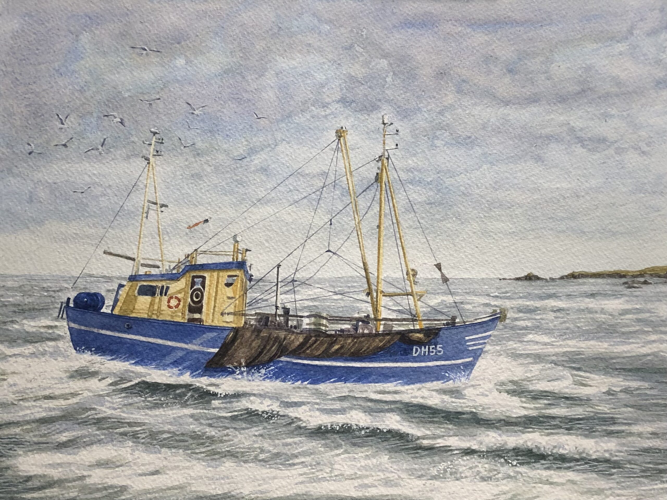 Limited edition signed mounted print of a Dartmouth Crabber coming in before the storm breaks after a days catch at Sea.