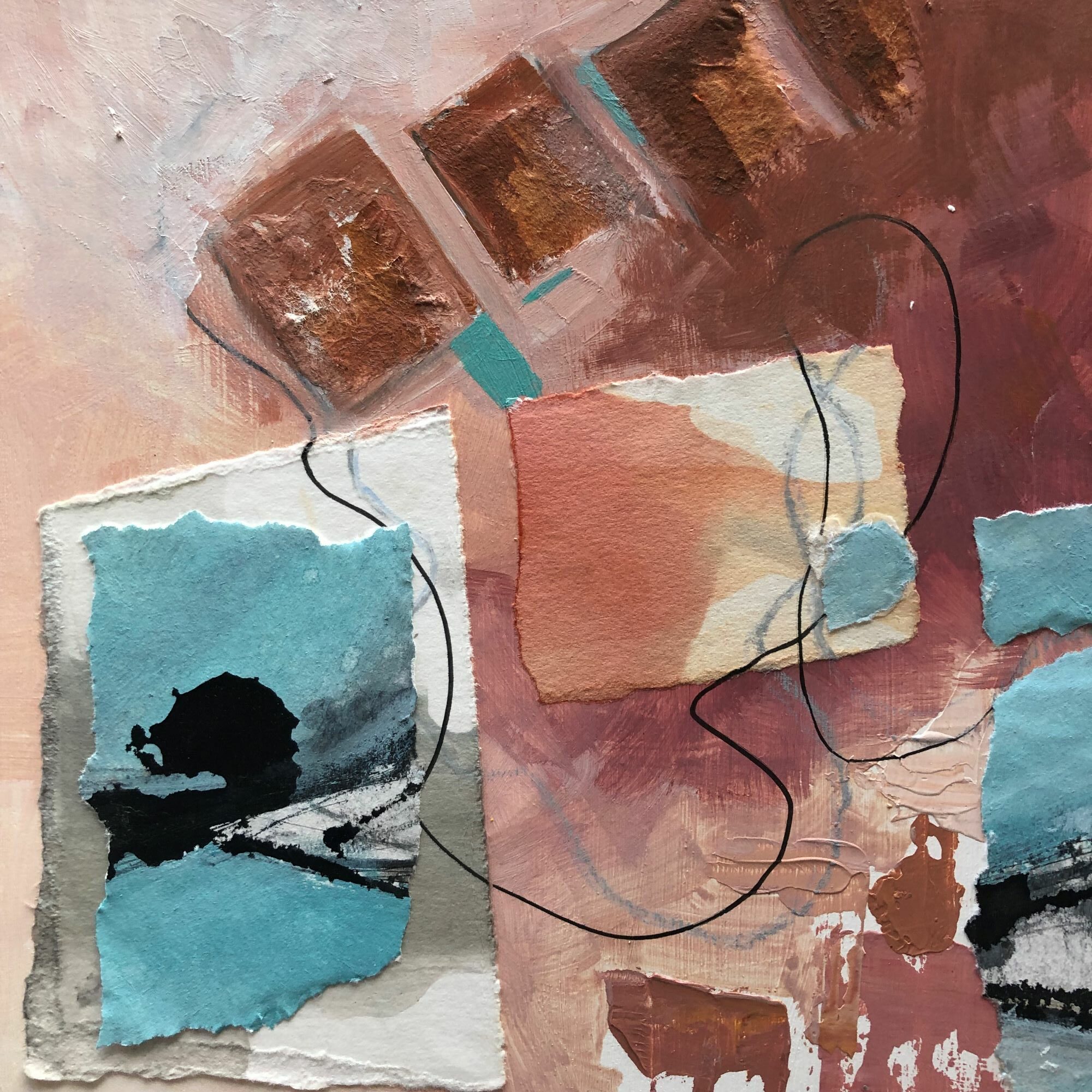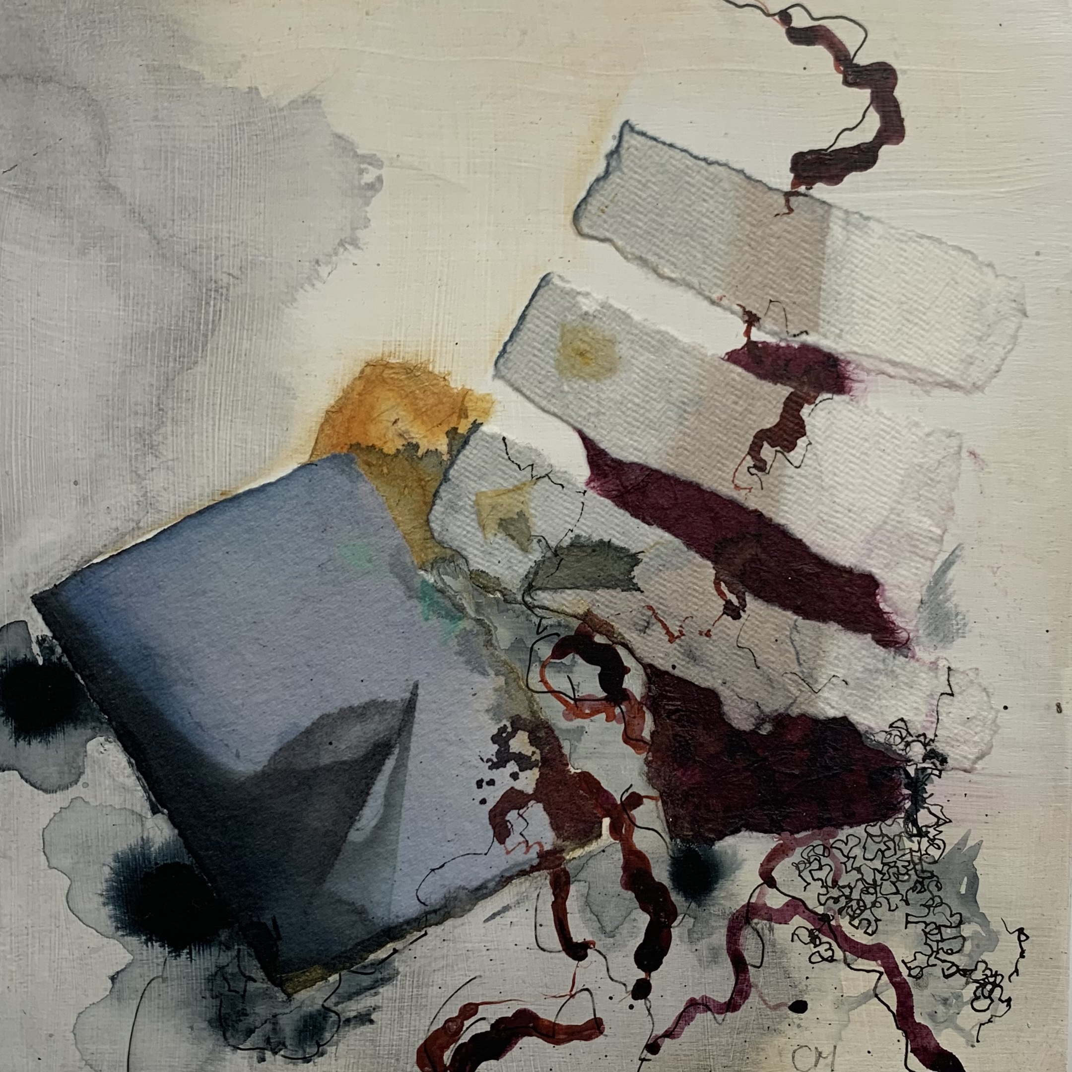 Worked on a wooden panel with mixed media - namely, collage, acrylic ink and paint and pen. Depicting the evening as disk falls and colours become more muted.
