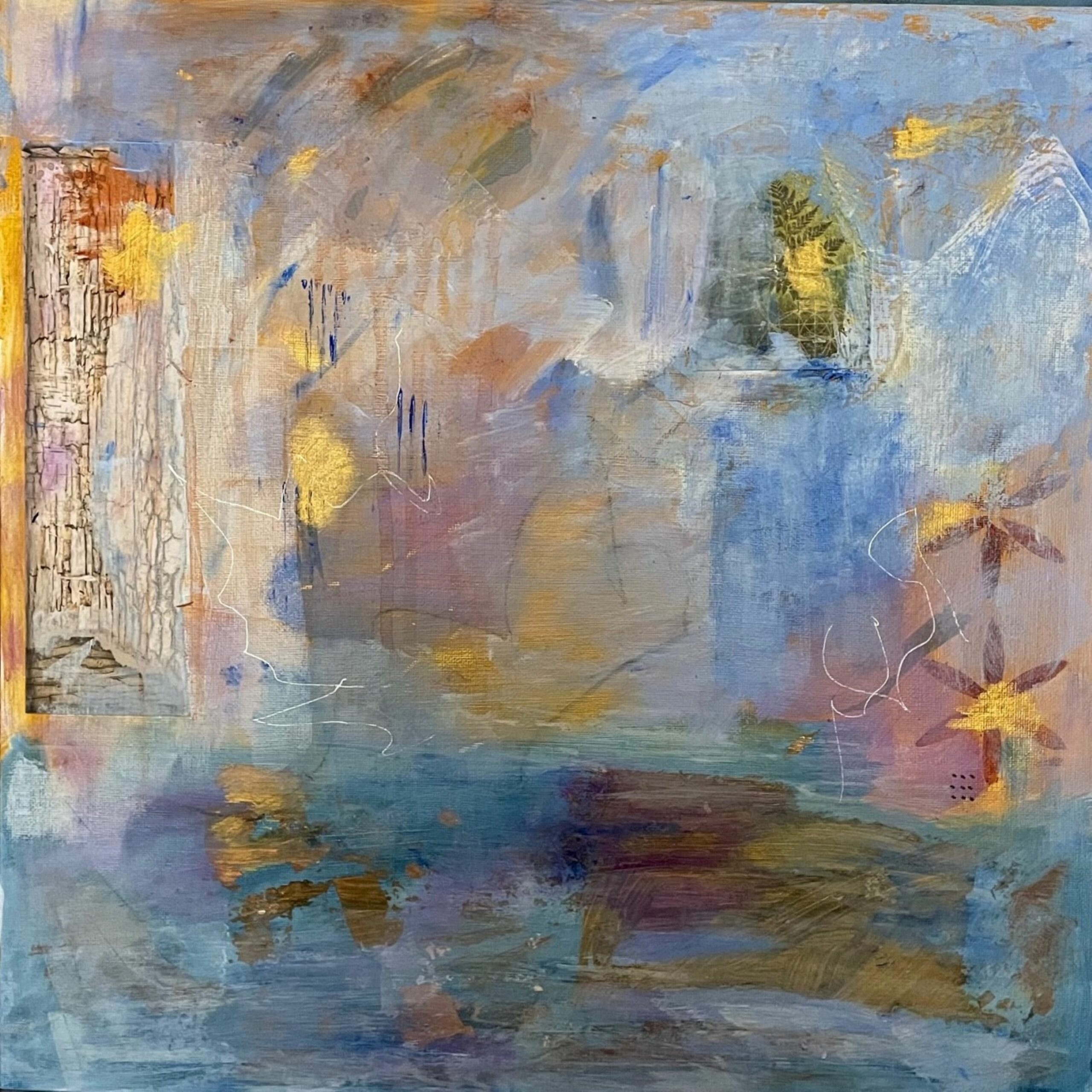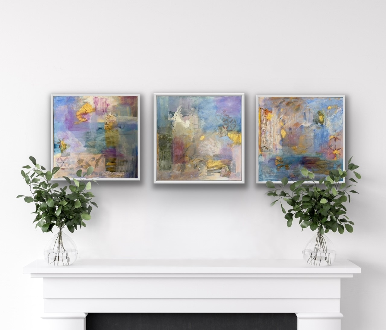 This original abstract painting on canvas board is mixed media and is 40cm x 40cm and arrives framed in a cream washed wooden frame ready to hang. This is part of a series of 3 artworks entitled Evolving and is a beautiful addition to your home interior with soft blues and purples and hints of gold.