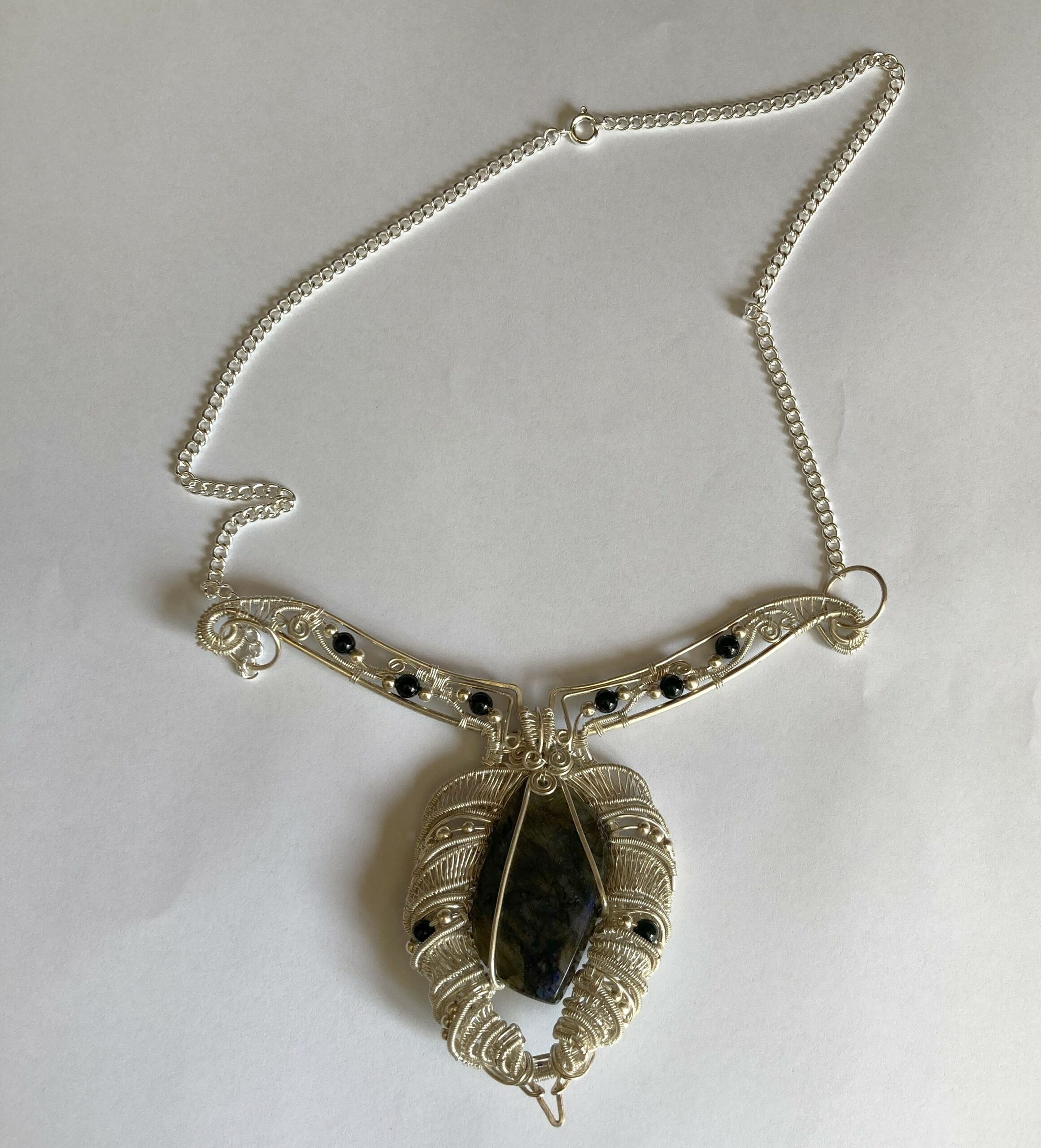 Labradorite gemstone with silver filled wire and onyx and sterling silver accent beads - mini sculpture
