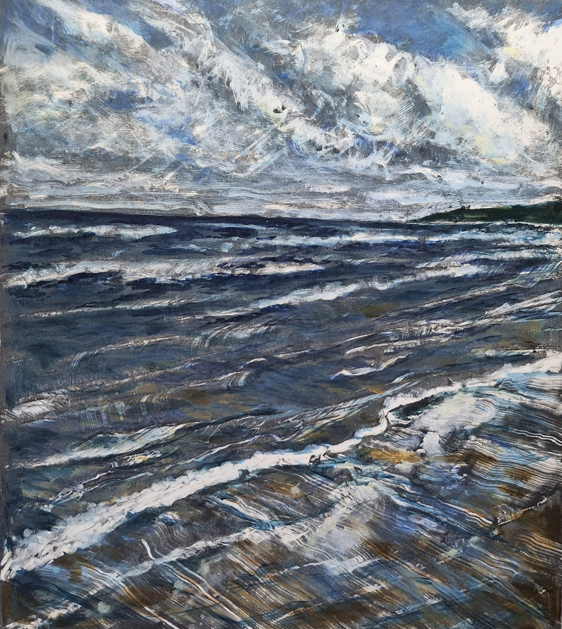 Rosie is a keen beach go-er living on the Atlantic coast of North Devon, captivated by the shore line, the ever changing light, mood, and skies: a different every visi. Recenlty she developed a new media practice: oil on monotype prints - Rosie calls them ‘fake paintings’ F.P. reflecting their reception by the Royal Academy: printmaking as an Art wasn’t accepted until 1909, 140 years after the Summer Exhibition was established. Monotypes, ‘the painterly print’, championed by the likes of William Blake and Edgar Degas, are made by working into an inked smooth surface, one impression or pull can be made and a second ghost image sometimes successfully drawn from the plate. The drawn /scratched /wetted inked plate is printed on damp paper using an etching press. The compression of the fibres means oil paint can be added in thin glazes to add colour to the prints, like a primed surface. They are much faster than oil painting and wonderfully unpredictable - expressive and unique - the mirroring of the drawn image to the paper is mysterious and enables the media to dictate the finished outcome, fluid and freeing.