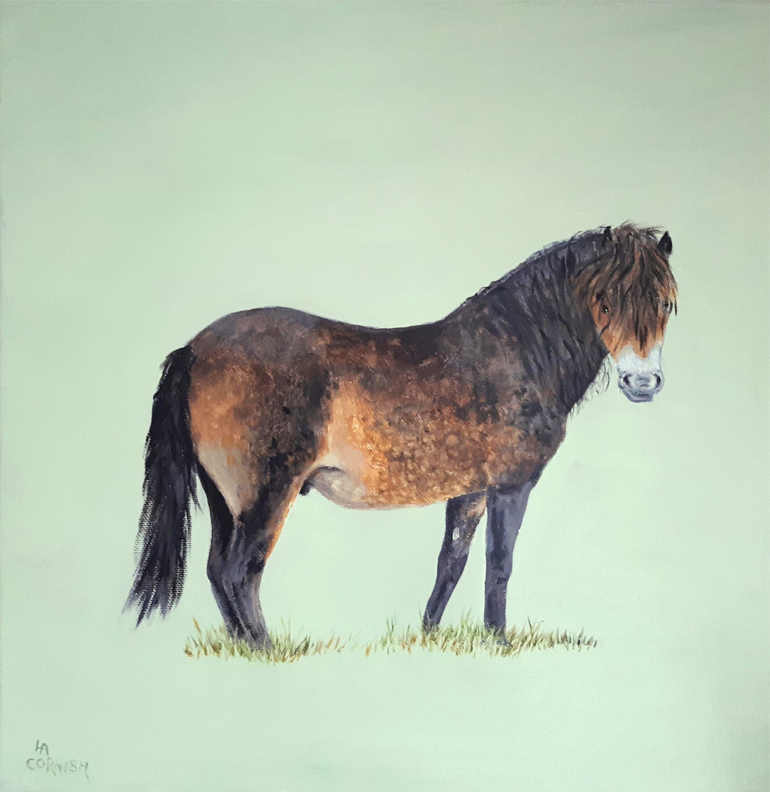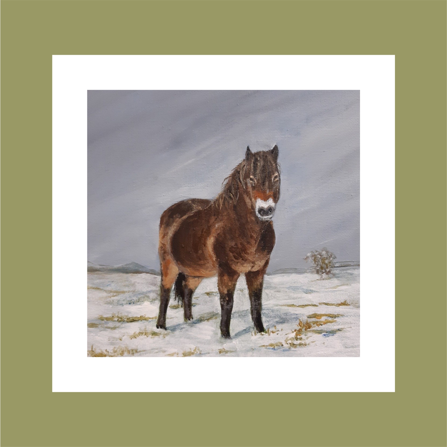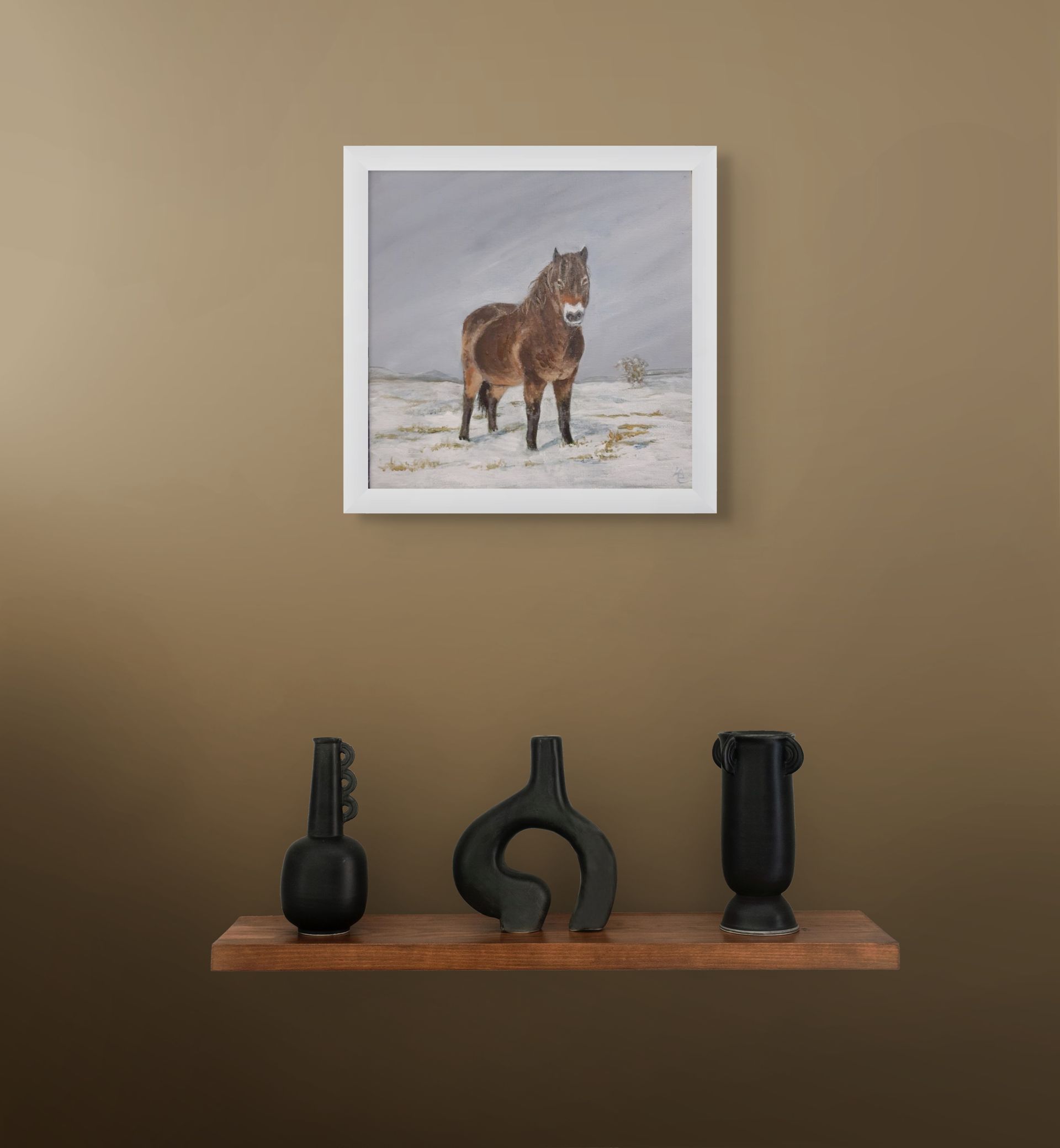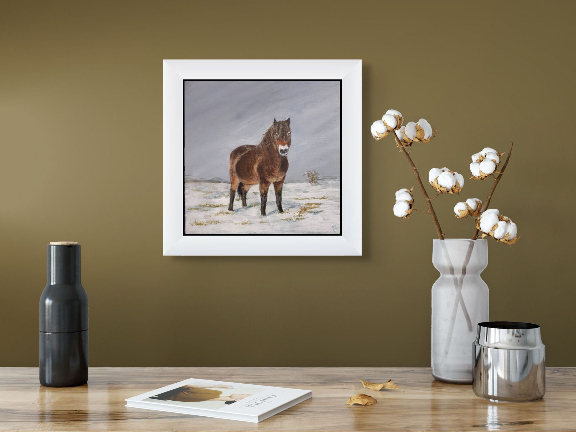 This Exmoor pony is well adapted to life on the moor, his thick coat will keep him warm in the winter snow. A small work, framed in white, for sale with certification.