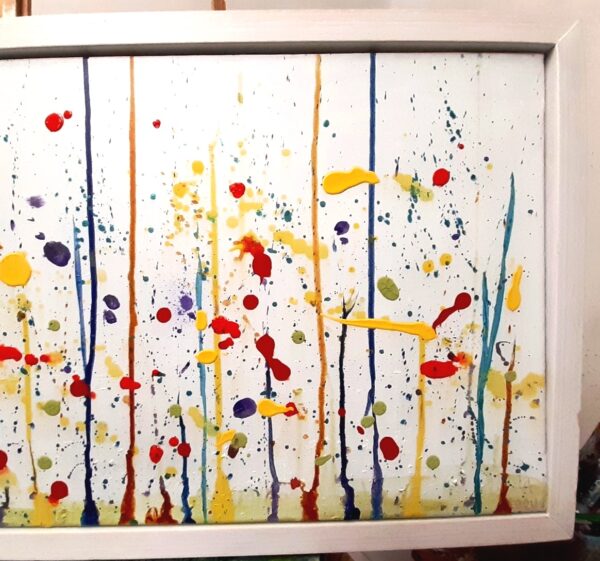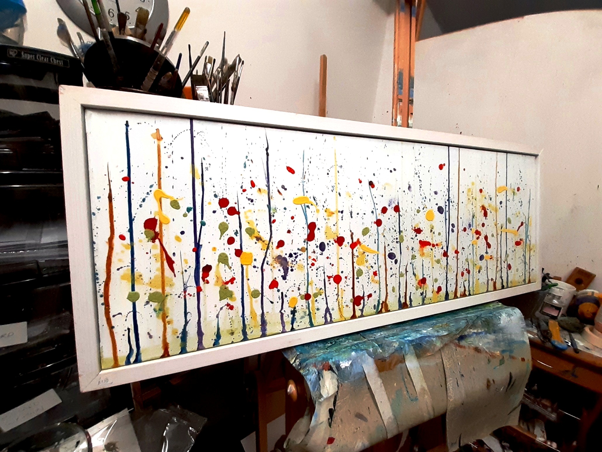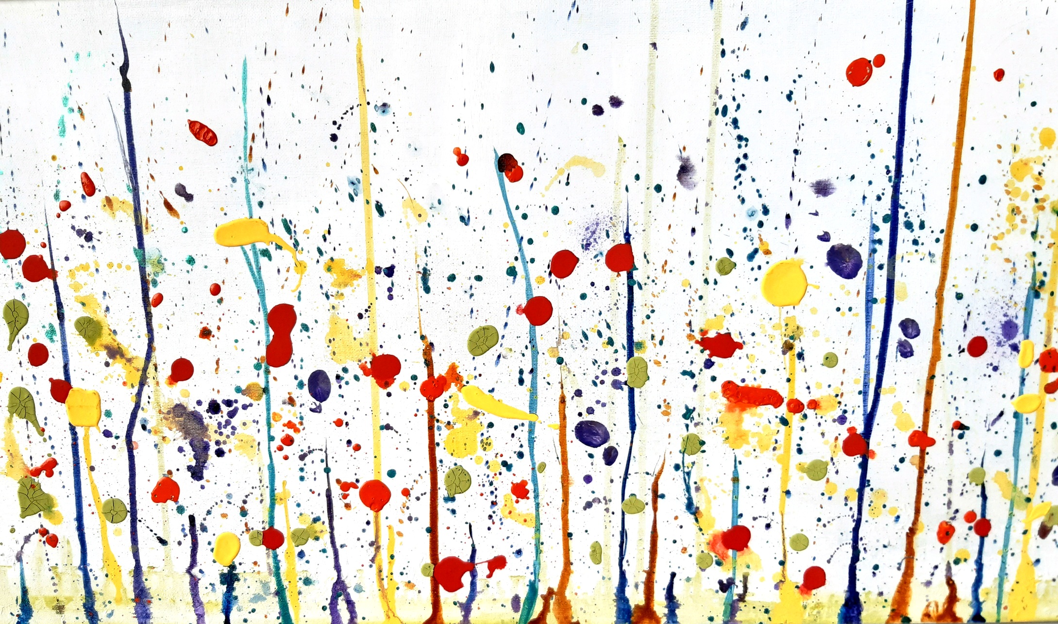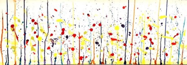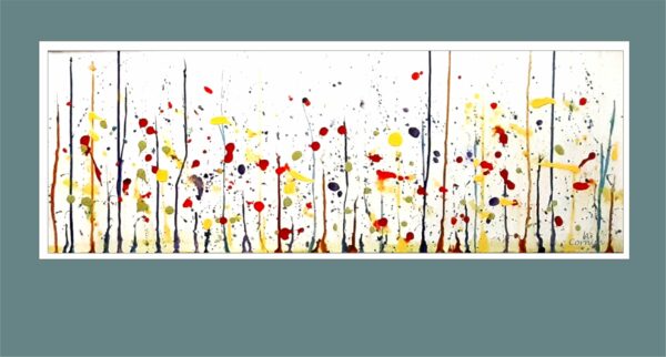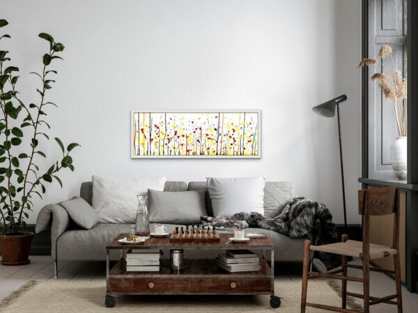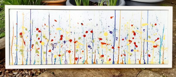 A great panoramic painting to brighten any wall. Abstract flowers in splashes of red, yellow green and purple on a white ground, are painted in acrylics on a standard canvas. Set in a white float frame ready to hang. A Certificate of Authenticity is included.