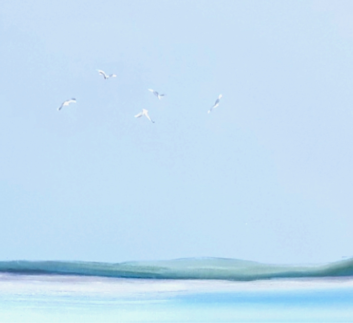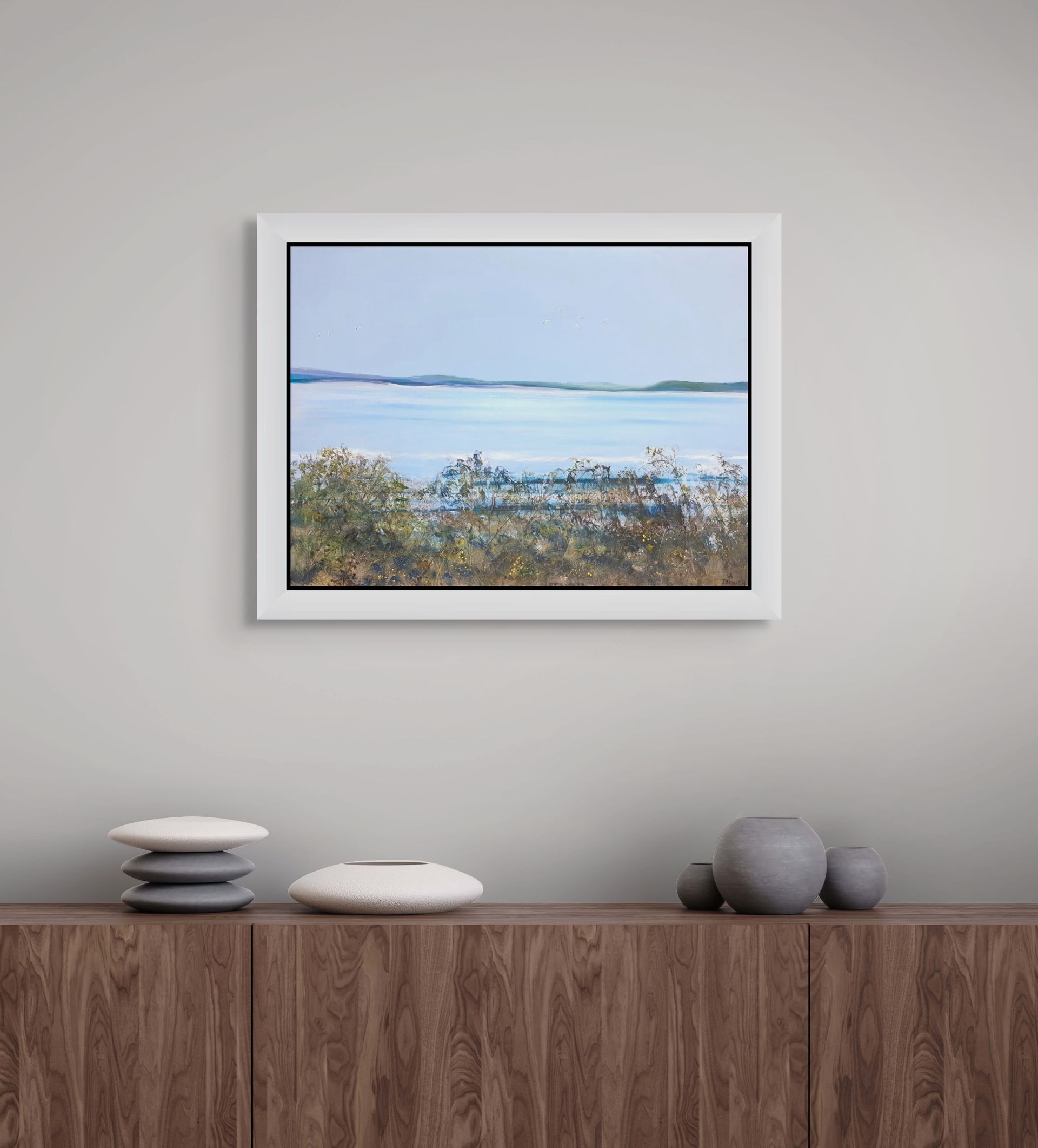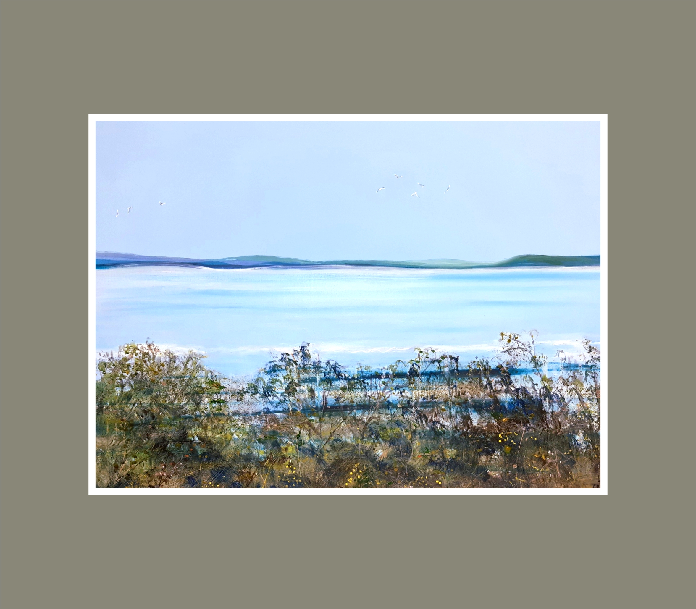 This acrylic painting represents a view through coastal brambles to the Torridge Estuary beyond, with the local seagulls flying high in the clear blue sky. Presented on deep edge canvas, can be framed at purchaser's request. For sale with certification.