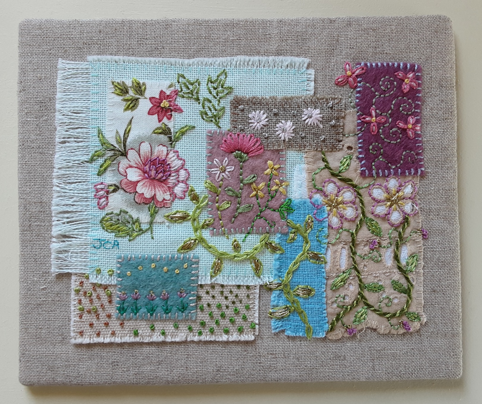 A richly hand-stitched textile artwork featuring embroidery and appliqué using vintage and modern threads and textiles, stitched onto natural undyed linen. The piece evokes the floral abundance of an English garden in summer, showcasing a range of techniques and a beautiful vibrant naturalistic palette. The artwork is float-mounted within a wooden box-frame, behind glass.