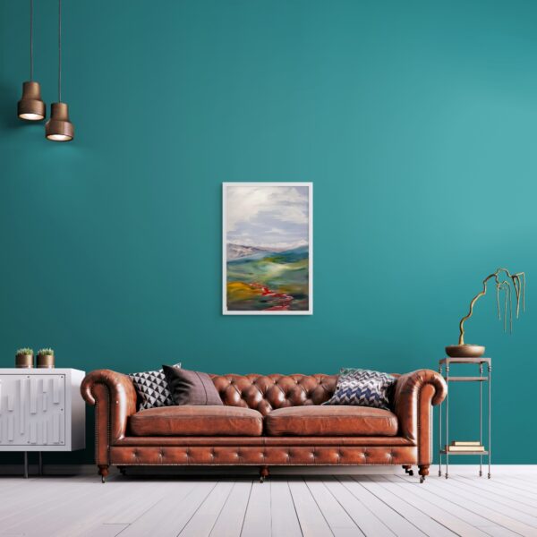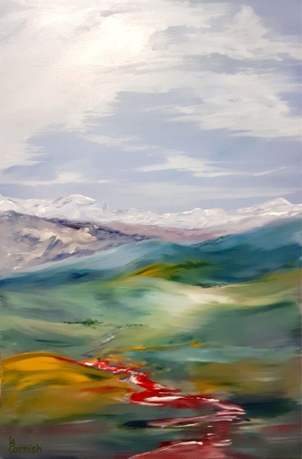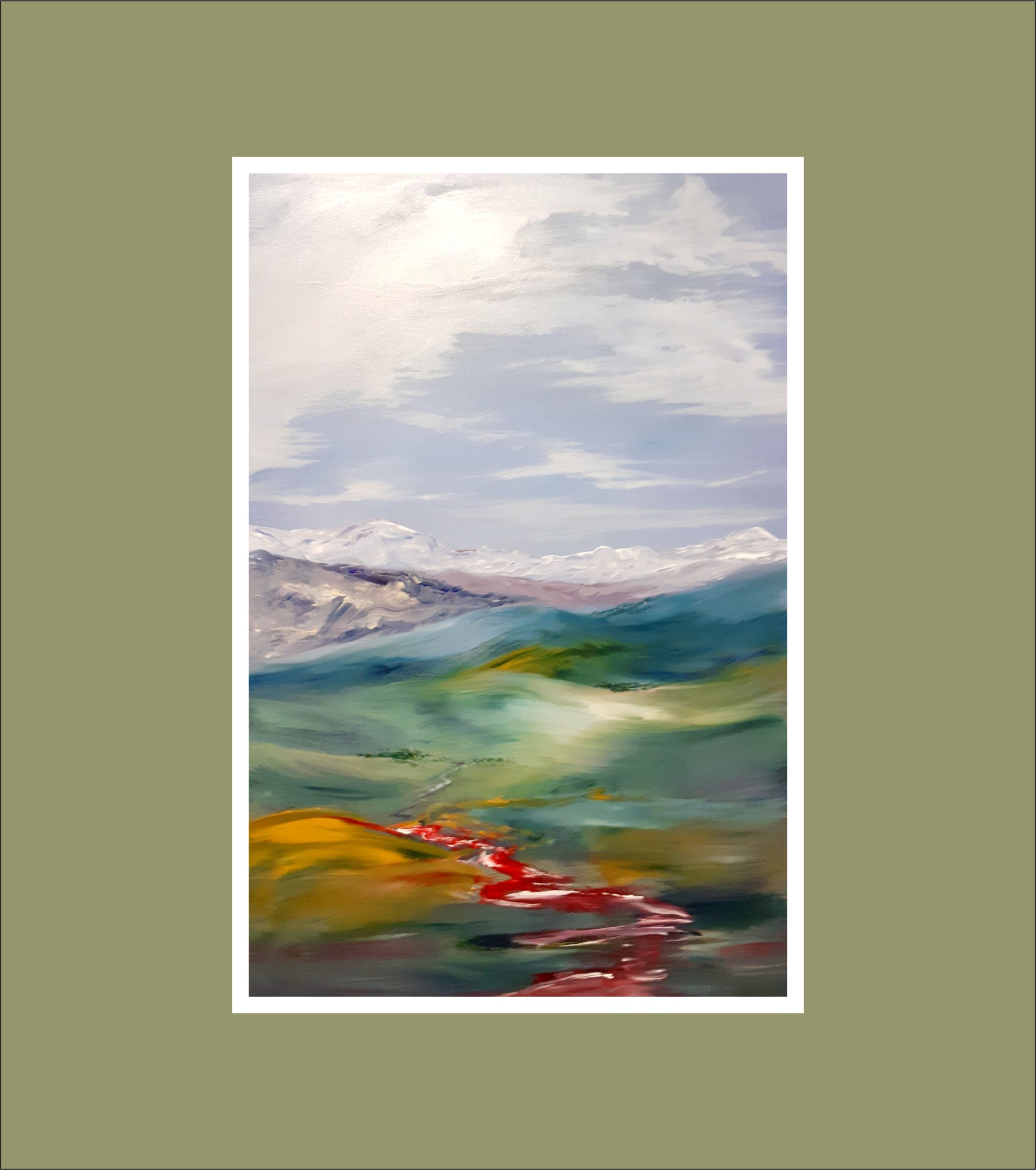 This is landscape with attitude, a path leading to who know's where, plenty of space in which to lose yourself! Hills and mountains under a big sky, painted in acrylics.