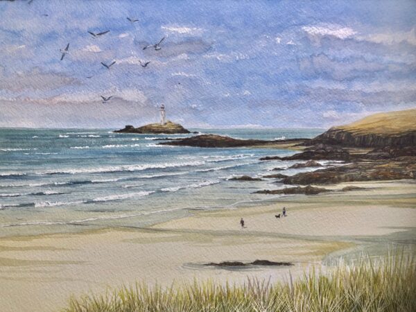 Limited edition signed and mounted print of Godrevy Lighthouse Cornwall capturing couple walking the dog on the beach on the approaching tide