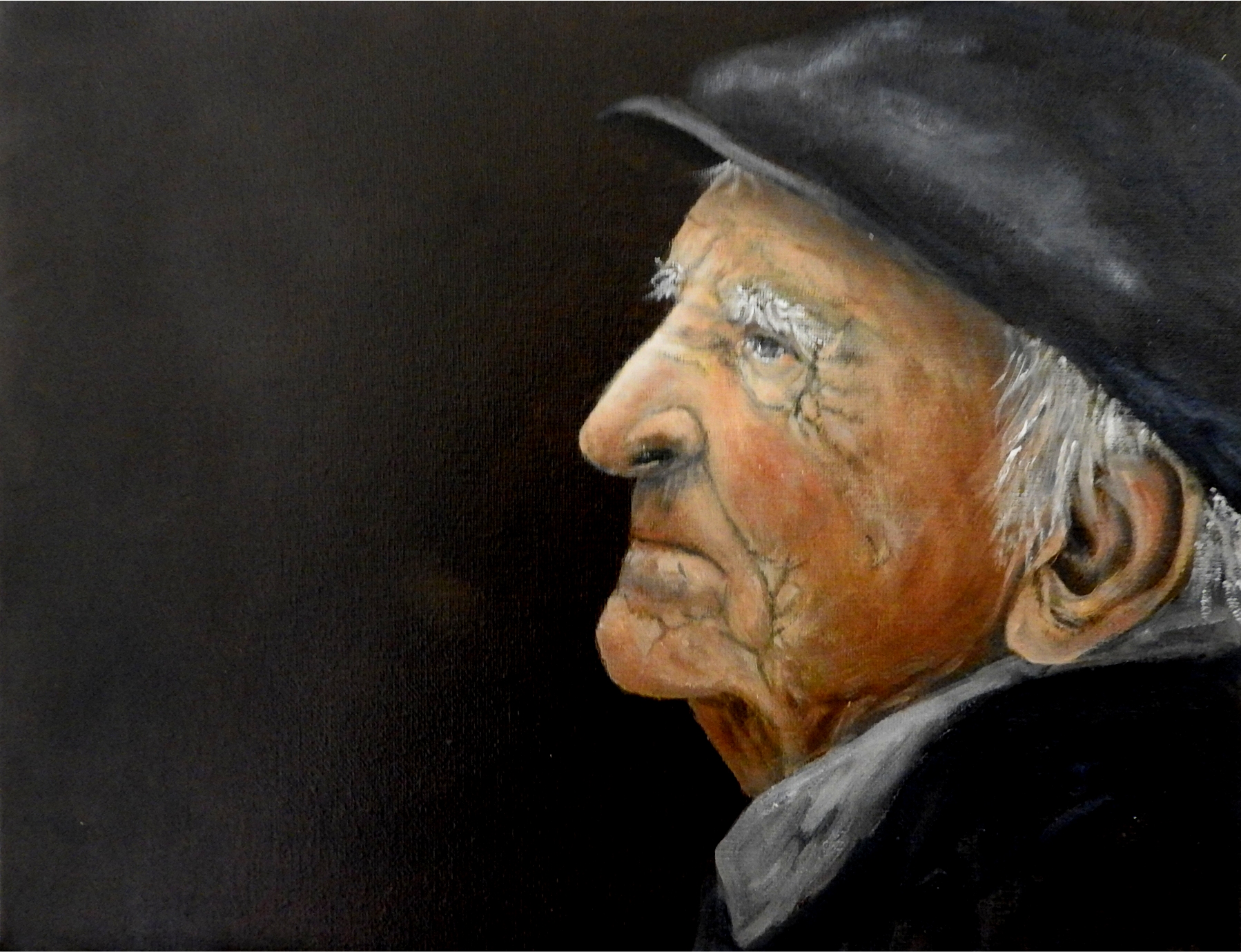 Harry from Lyme, a character head study of an elderly gentleman wearing a flat cap. Painted in oils on a standard edge canvas. For sale unframed with certification.