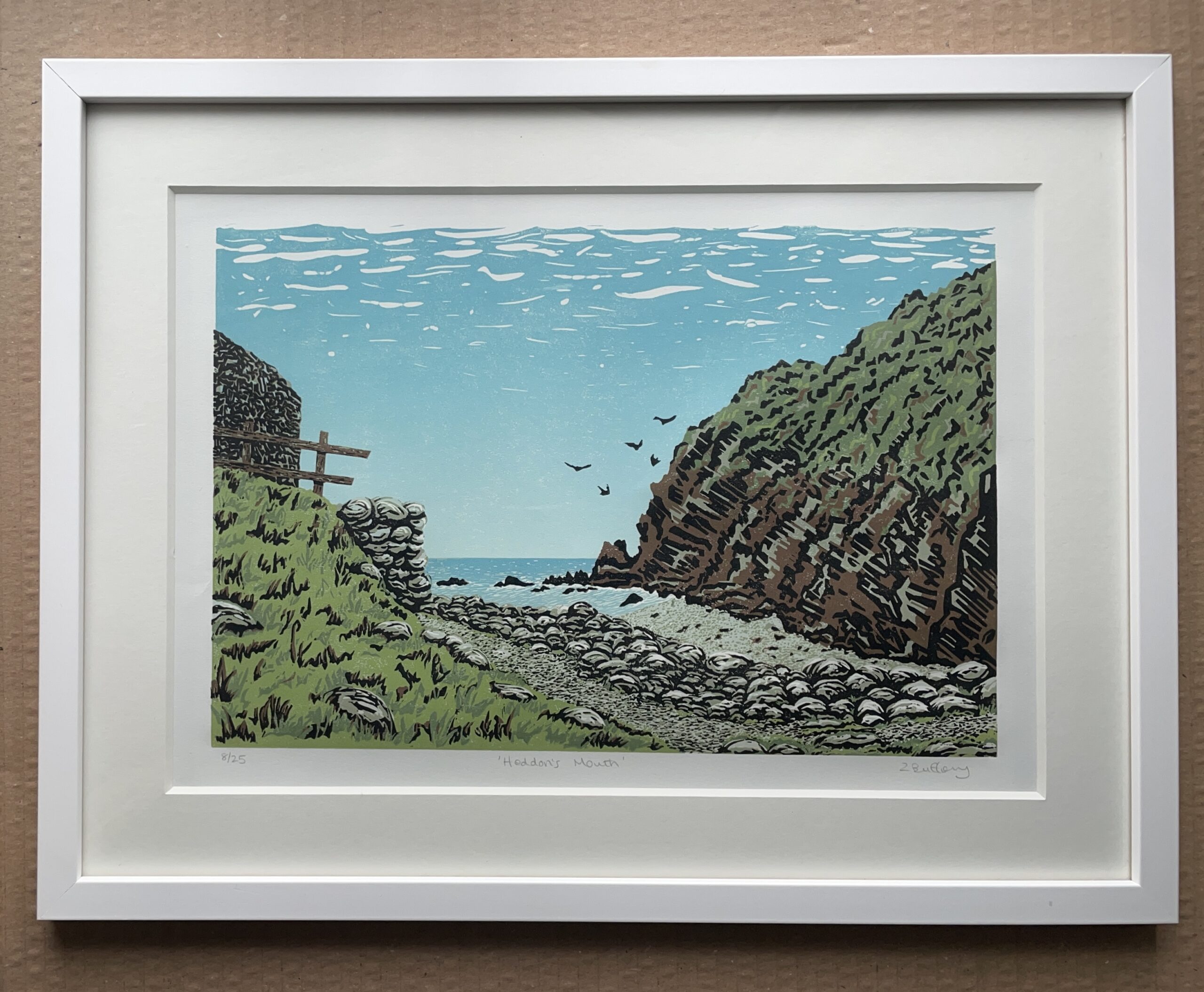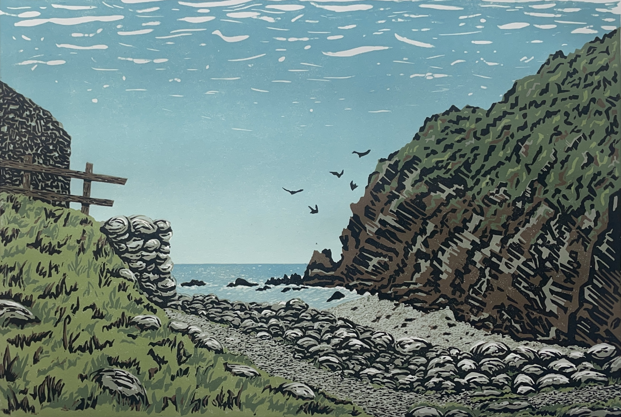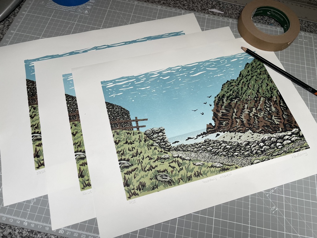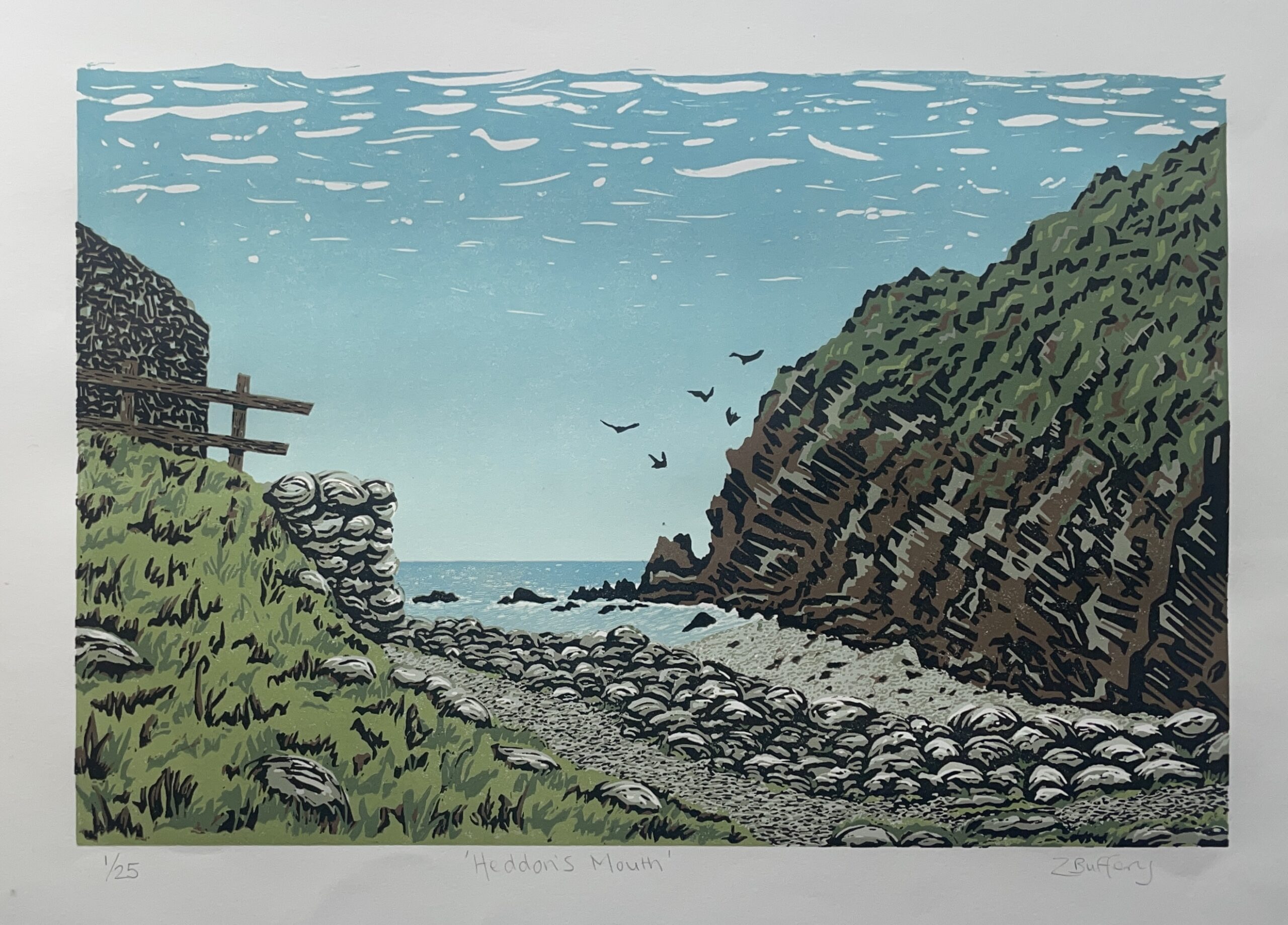 Handmade, limited edition eight-layer reduction linocut of the beautiful Heddon’s Mouth on the North Devon coast of Exmoor. Image size is approx 30cm x 20cm, plus generous border to allow for framing. Limited edition of 25 Each print is numbered and signed by myself on the front of the artwork. Caligo Safewash printmakers ink, on 145gsm acid-free archival printmakers paper. Reduction technique. Sold unframed and unmounted