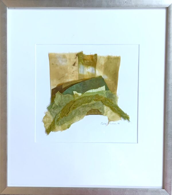 Worked in dyed textiles and collage depicting a hillside and the distant landscape.