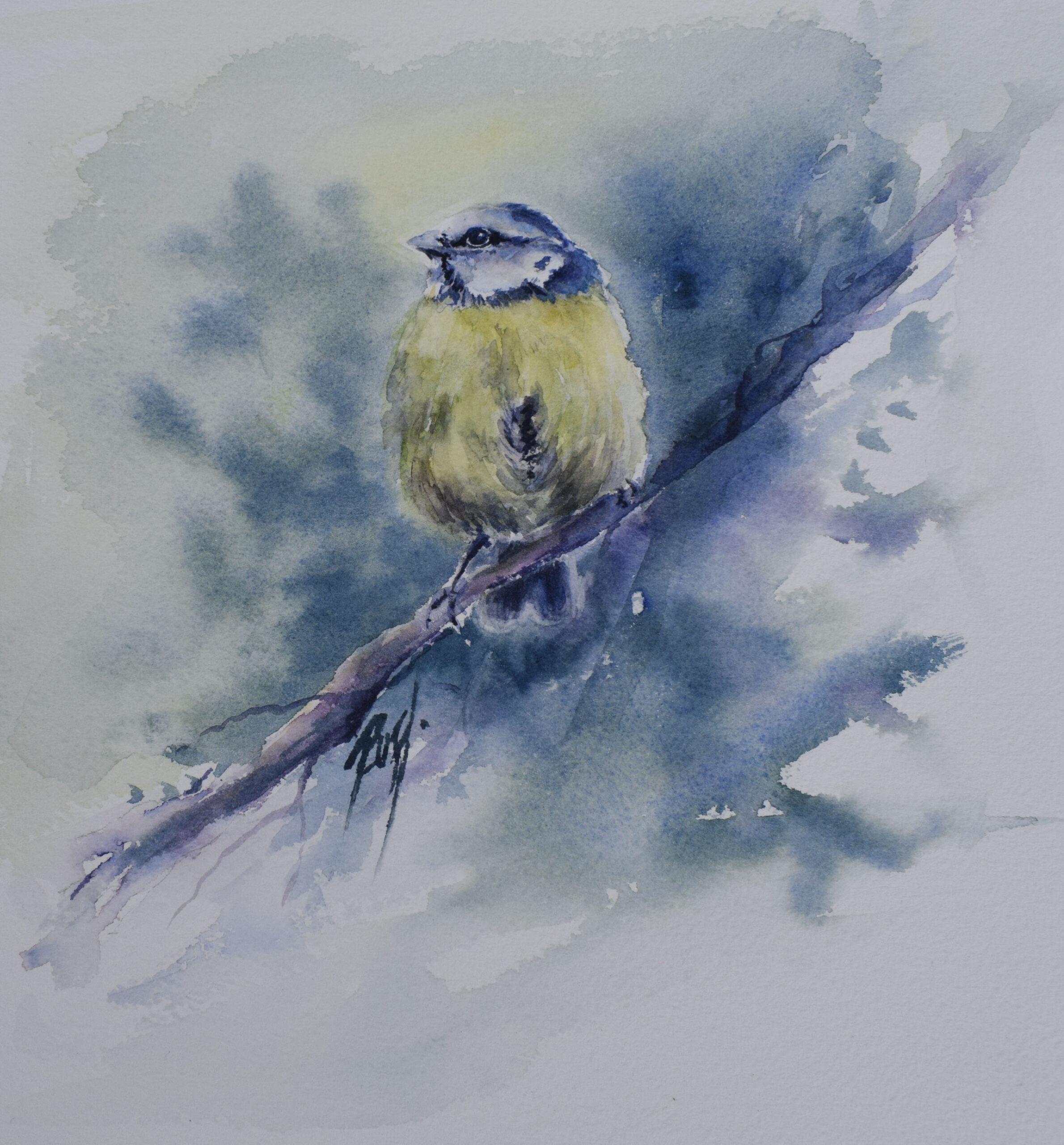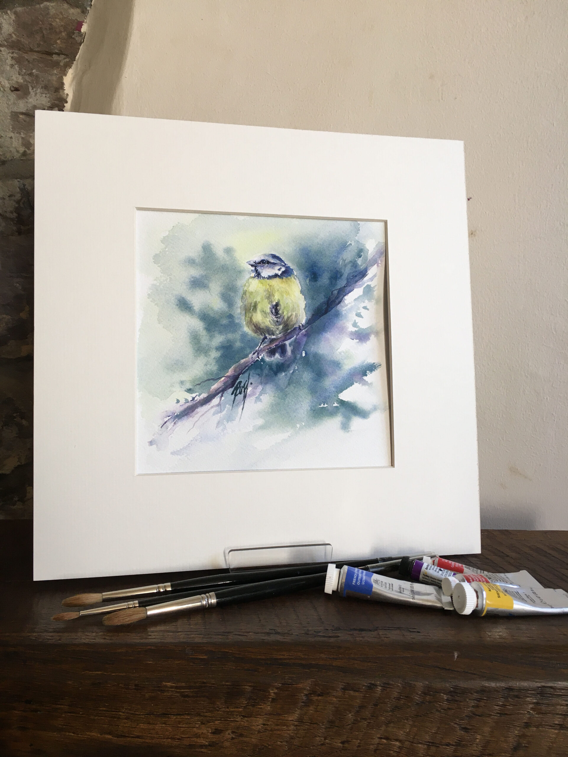 This is an original watercolour painting depicting one of my favourite British garden birds; "The Bluetit" This watercolour is painted on 100% pure cotton paper and is available mounted in a 12" x 12" square cream mount.