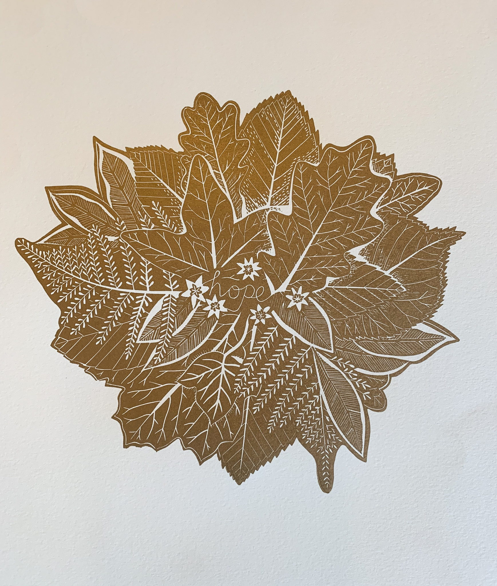 Let this print, featuring the word ‘hope’ encircled by leaves, flowers and ferns, inspire you to hope, dream and take courage. This is an original artwork printed in gold ink on white Fabriano fine art paper