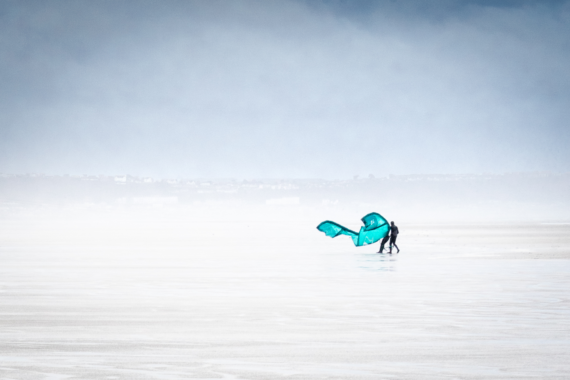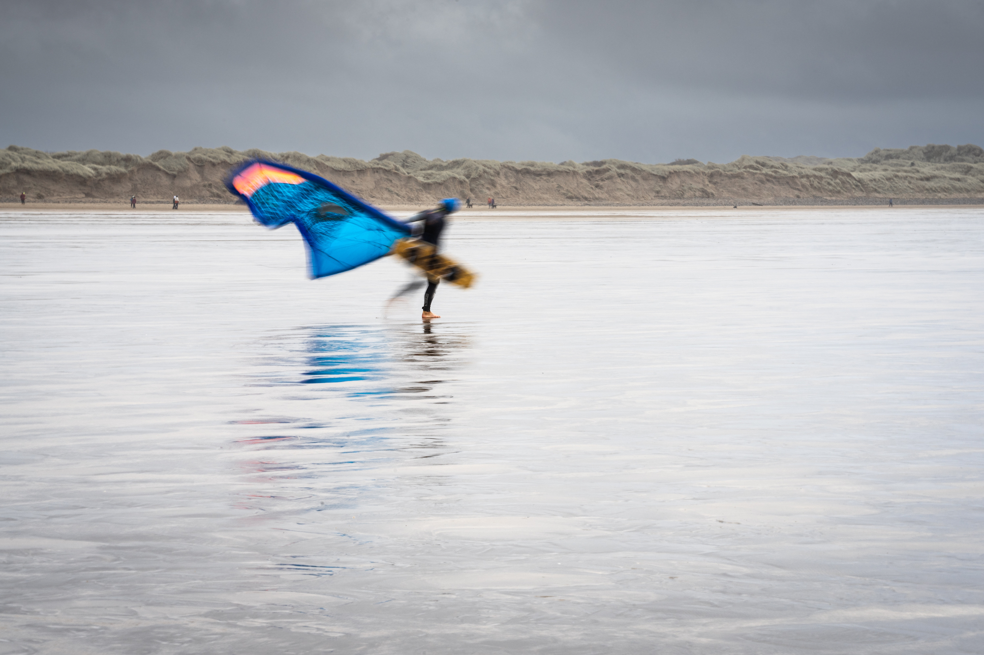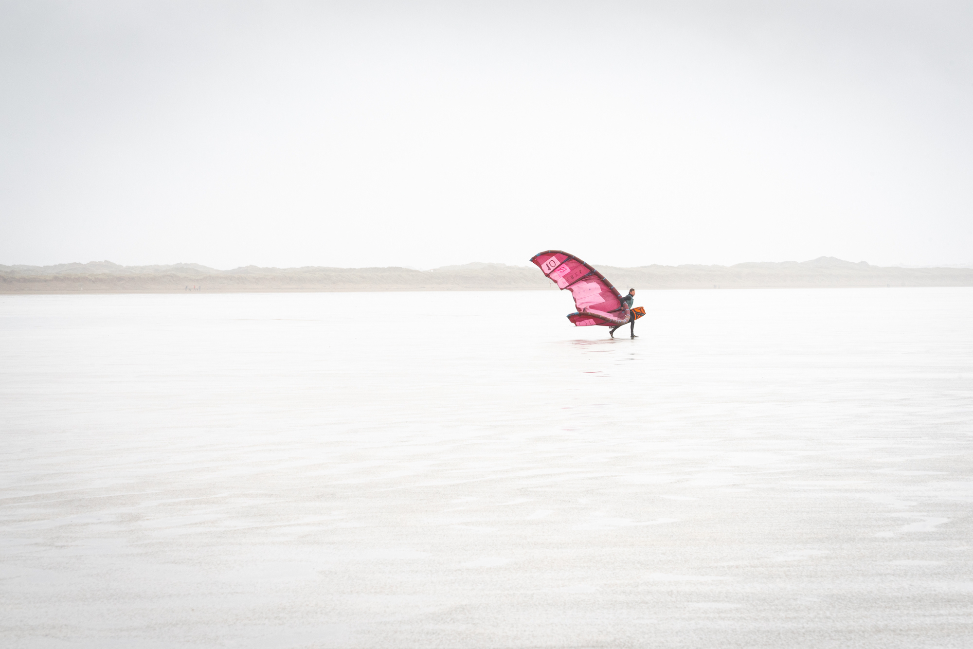 The Devon coast is as varied in climatic conditions as it is in physical geography. The coves and beaches can be micro-climates and experience their own weather patterns. On this day the sea mist was heavy and the wind a gale. Ideal conditions for the bravest of kite surfers. In their long march from the dunes to the sea the squall folded the brightly marked kites behind the surfers - a beautiful transformation.