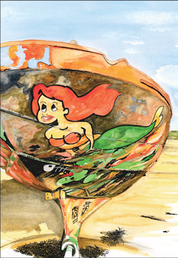 Watercolour limited edition signed print of a graffiti covered Trawler BM202 wreck on Seconds Beach towards Yelland in Instow focusing on Ariel on the Bow