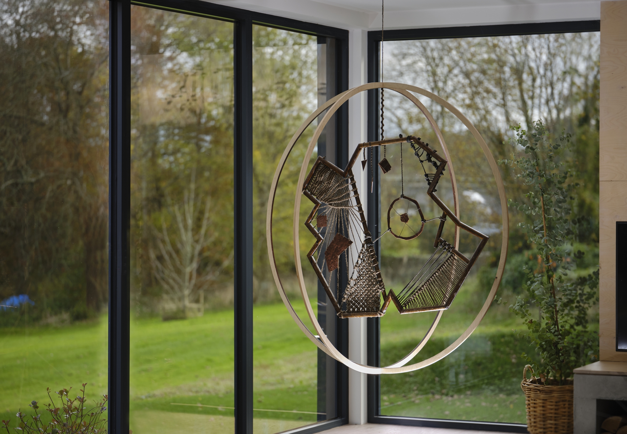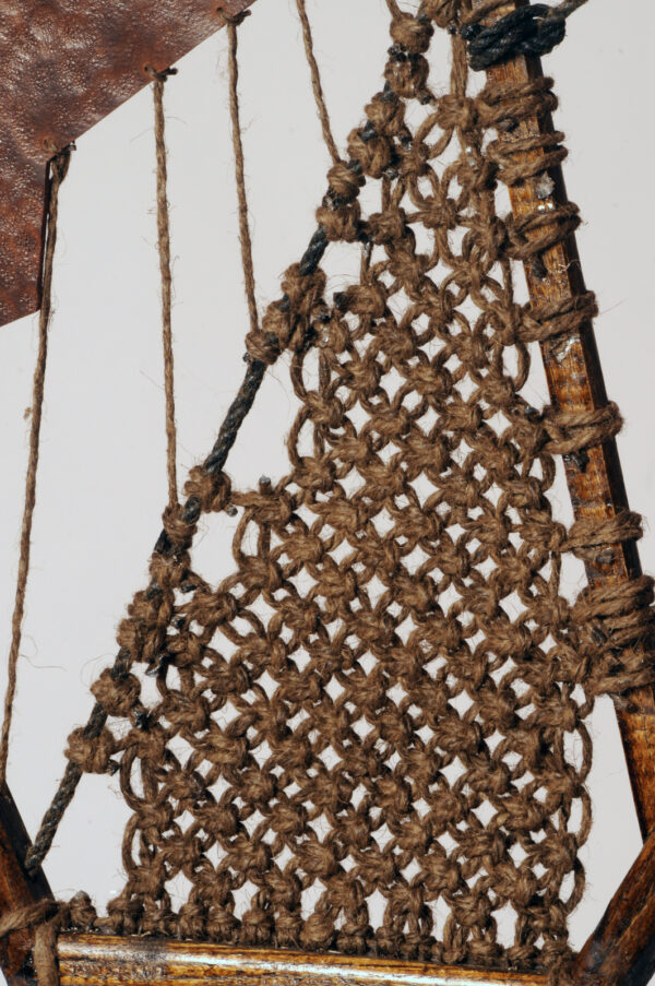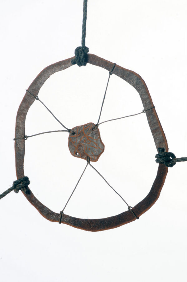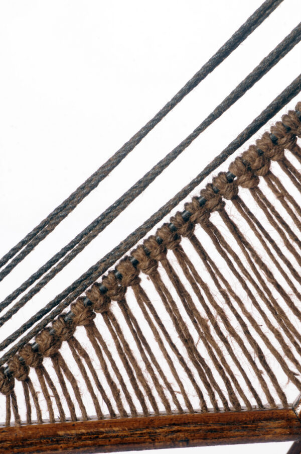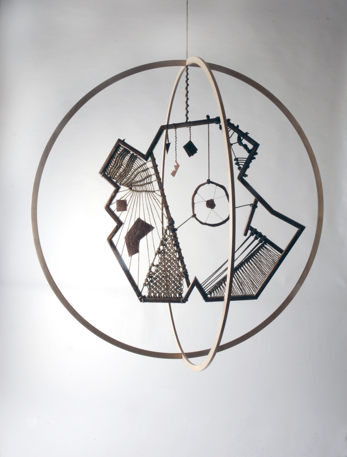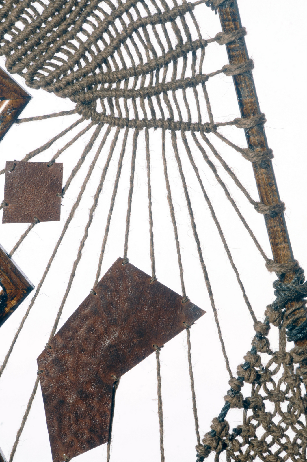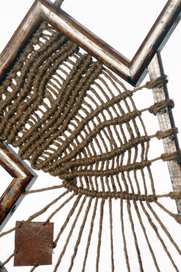 In 2016, Edward visited The Isles of Scilly and was inspired to create a series of hanging rope sculptures called Island II, III, and IV. He recorded the tidal changes of the islands by drawing and photographing the rocks seen at low tide – a treacherous area for ships. To connect the shipwrecks of the past to the landscape, Edward used traditional shipbuilding materials to shape the sculptures in the form of the island’s rocks. The sculptures are encased in two overlapping circles, creating a spherical juxtaposition to the angular island hanging within. The natural materials used in the sculptures relate to the island’s past and present inhabitants, who relied heavily on natural resources for survival due to the islands’ remoteness. The rope used in the sculptures reflects the islands’ maritime history, while the patterns on the leather imitate the surface of the rocks found on The Isles of Scilly.