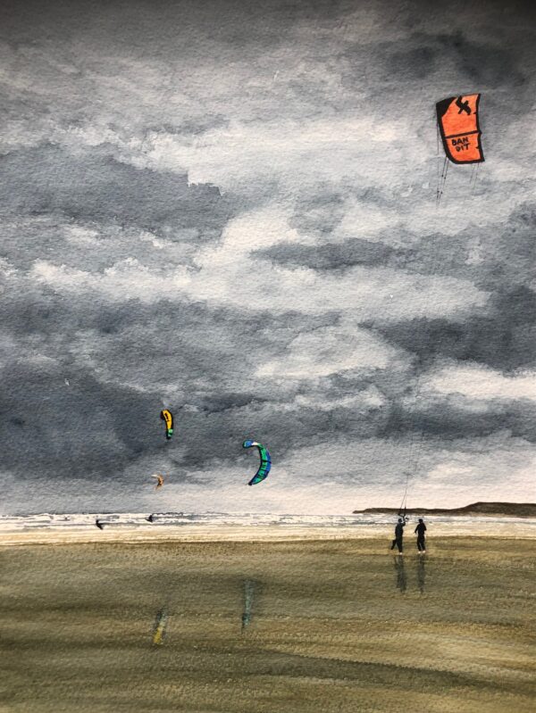 Framed original white grain wood and mounted in white Watercolour second in my series of Kite Surfers on Sandymere Beach Westward Ho! at low tide escaping from the approaching storm.