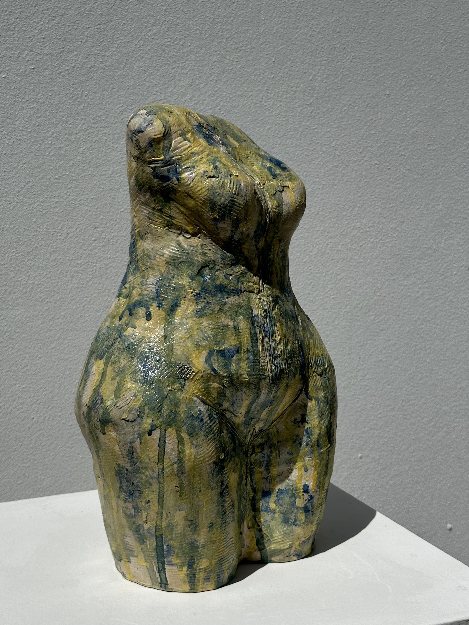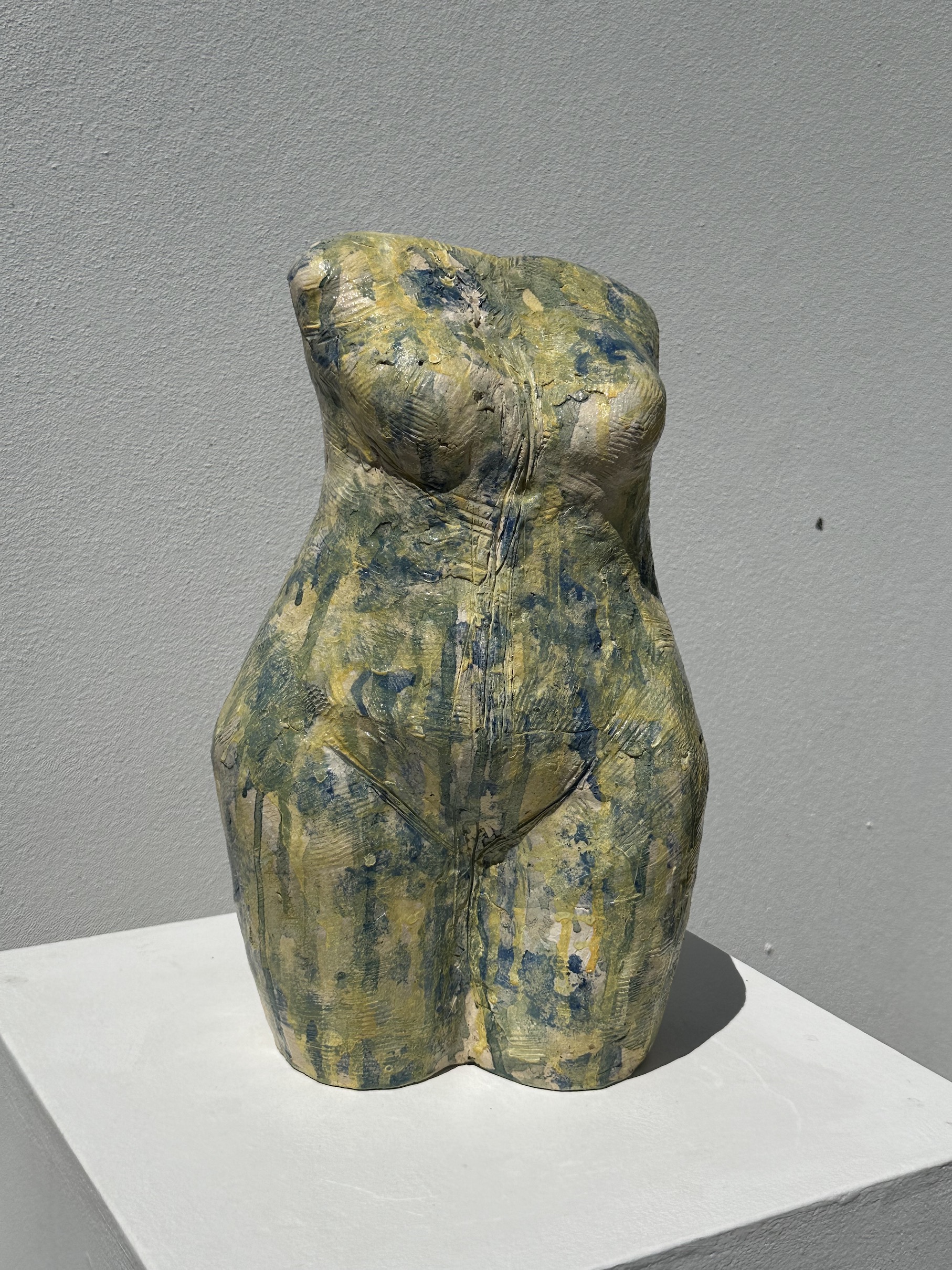 This is a beautiful colourful torso which can stand either indoors or in the garden. Handbuilt with delicate coils of clay, she is hollow but substantial with an interesting texture and a range of yellow and blue tones.
