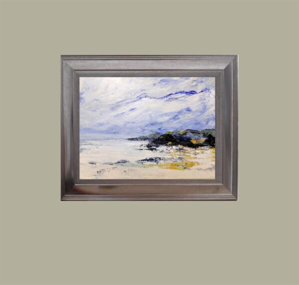 This work is a small impressionist landscape, produced with a palette knife on deep edge canvas. Contrasting tones suggest different textures for the ocean, sand and rocky cliffs. Inspired by my local hidden bays on the North Devon Coast. Presented in a natural wood float frame. Certification provided.