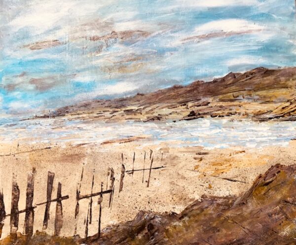 Mixed media seascape capturing the beach all low tide with land in the distance and depicting rocks and groynes