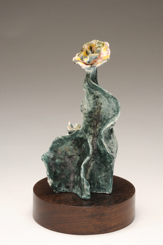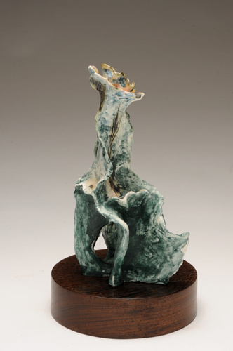 A lively little porcelain sculpture with vibrant spiralling forms that turn up towards a floral 'kiss' at the summit of the work. Marine blue and greens are evocative of the coastal environment where the piece was made. Base included in price.