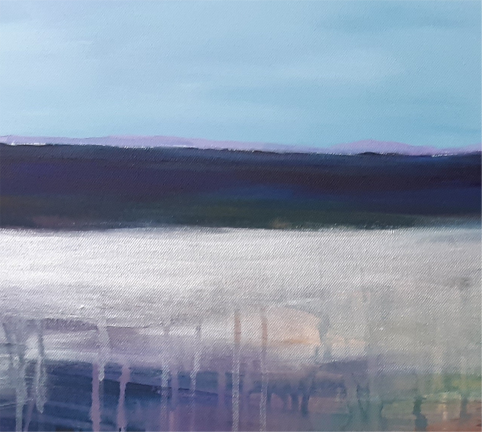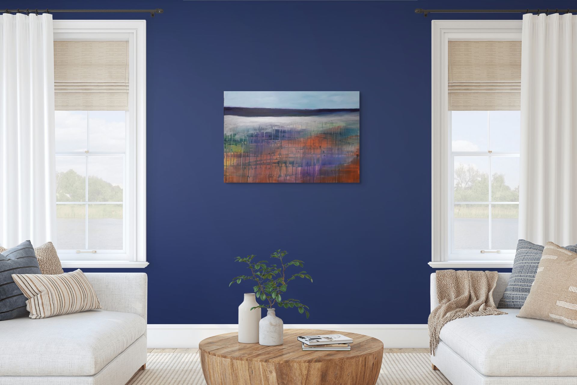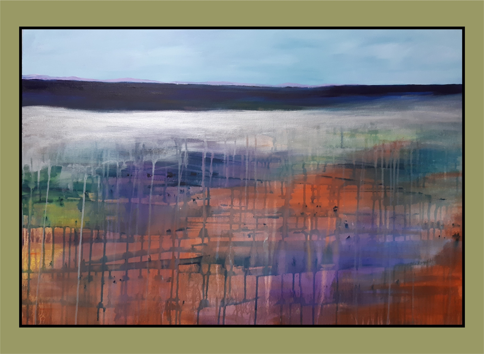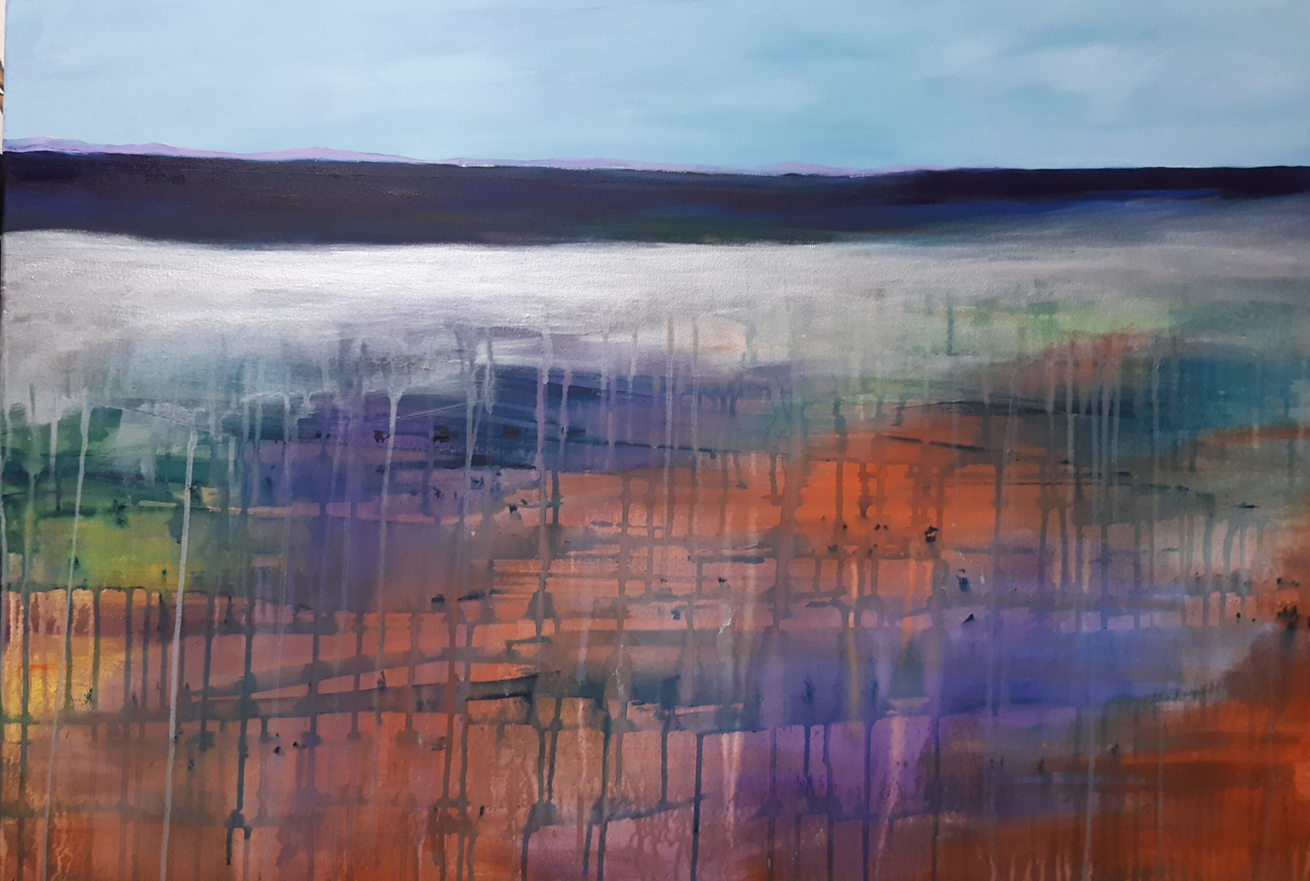 A large abstract work inspired by the moors and distant coast. A multitude of hues that reflect the moorland landscape, dominate the foreground, while the sea and distant hills lead off into the horizon. the sea is enhanced by the use of silver where the the highlights shift as the piece is viewed from different angles. Painted on standard canvas in acrylics.For sale with certification.